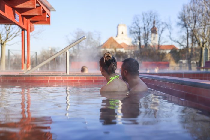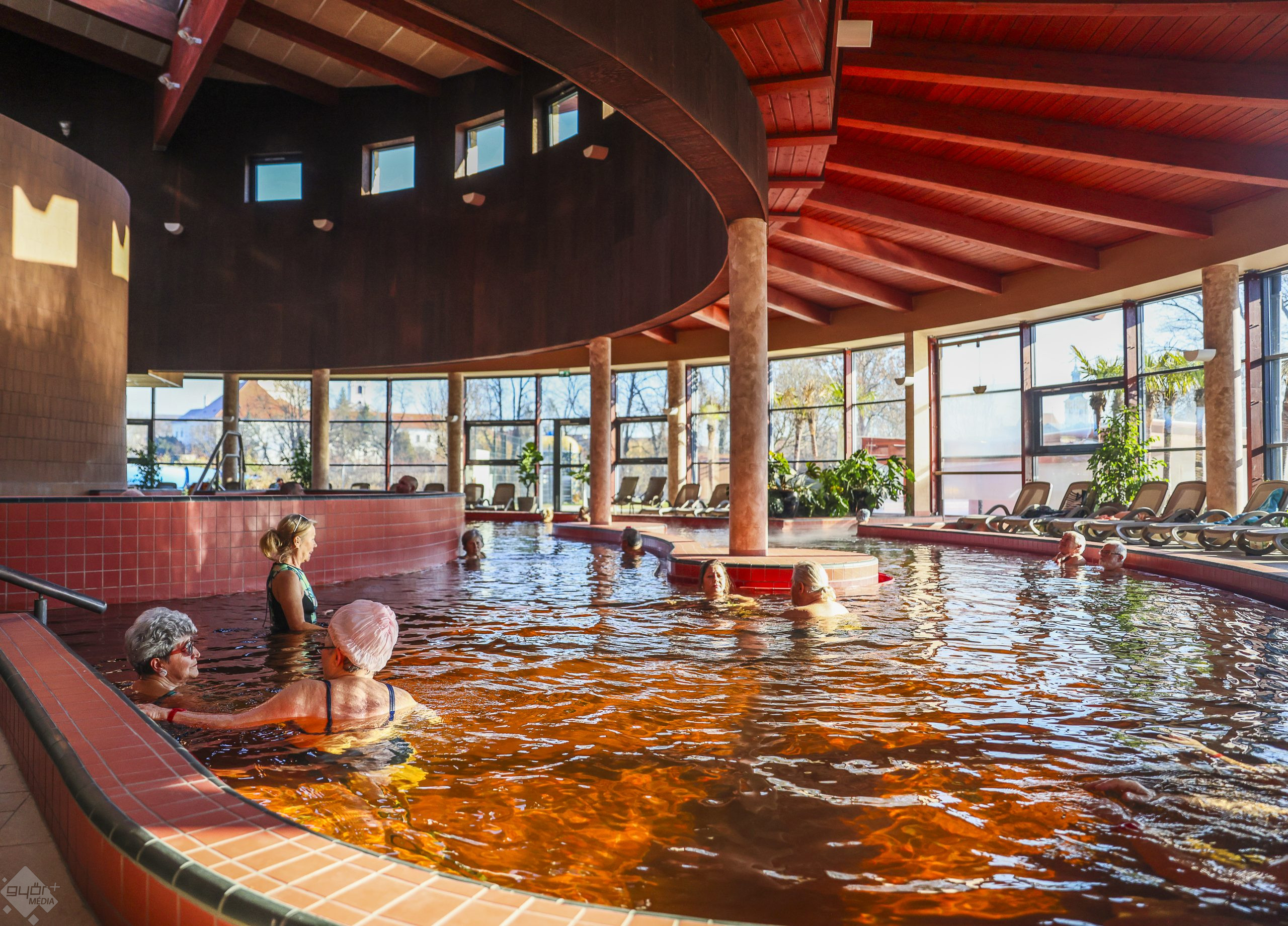 Óriási élmény a gőzölgő, selymes vizű medencében ülve, a történelmi belváros panorámájában gyönyörködve töltekezni a gyógyvíz pozitív energiáival. Két közepes méretű beltéri, és egy kiúszóval is rendelkező nagy gyógyvizes medence is várja a fürdő látogatóit.