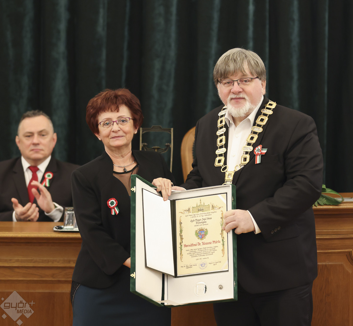 Horváthné Dr. Knausz Márta részére a Petz Aladár Egyetemi Oktató Kórházban a higiénia, a bakterológia, a minőségirányítás és a járványügy területén végzett kiemelkedő szakmai és vezetői munkája, valamint az oltóközpont működtetésében végzett fáradhatatlan tevékenysége elismeréseként Győr Megyei Jogú Város Díszpolgára kitüntető címet adományozták.