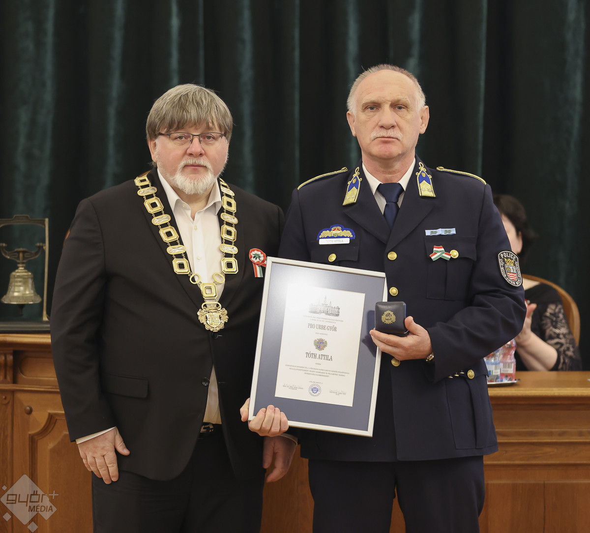 Tóth Attila részére kórházparancsnokként és a Győr-Moson-Sopron Megyei Rendőr-főkapitányság szolgálatvezetőjeként végzett kiemelkedő és példaértékű szakmai tevékenysége elismeréseként Pro Urbe Győr díjat adományoz.