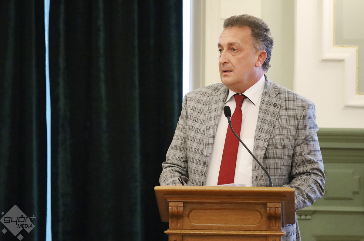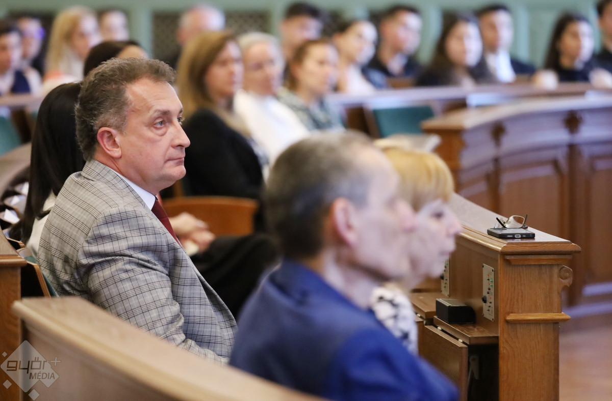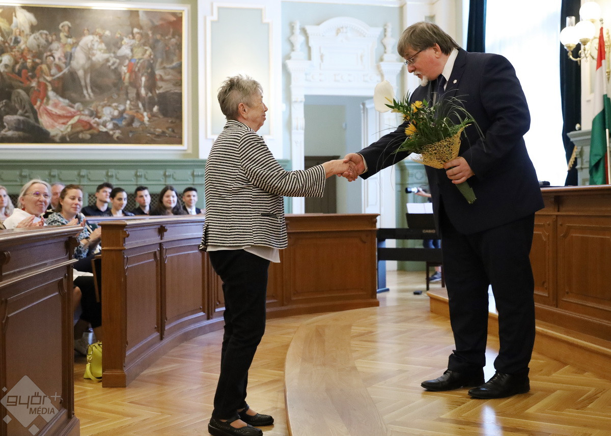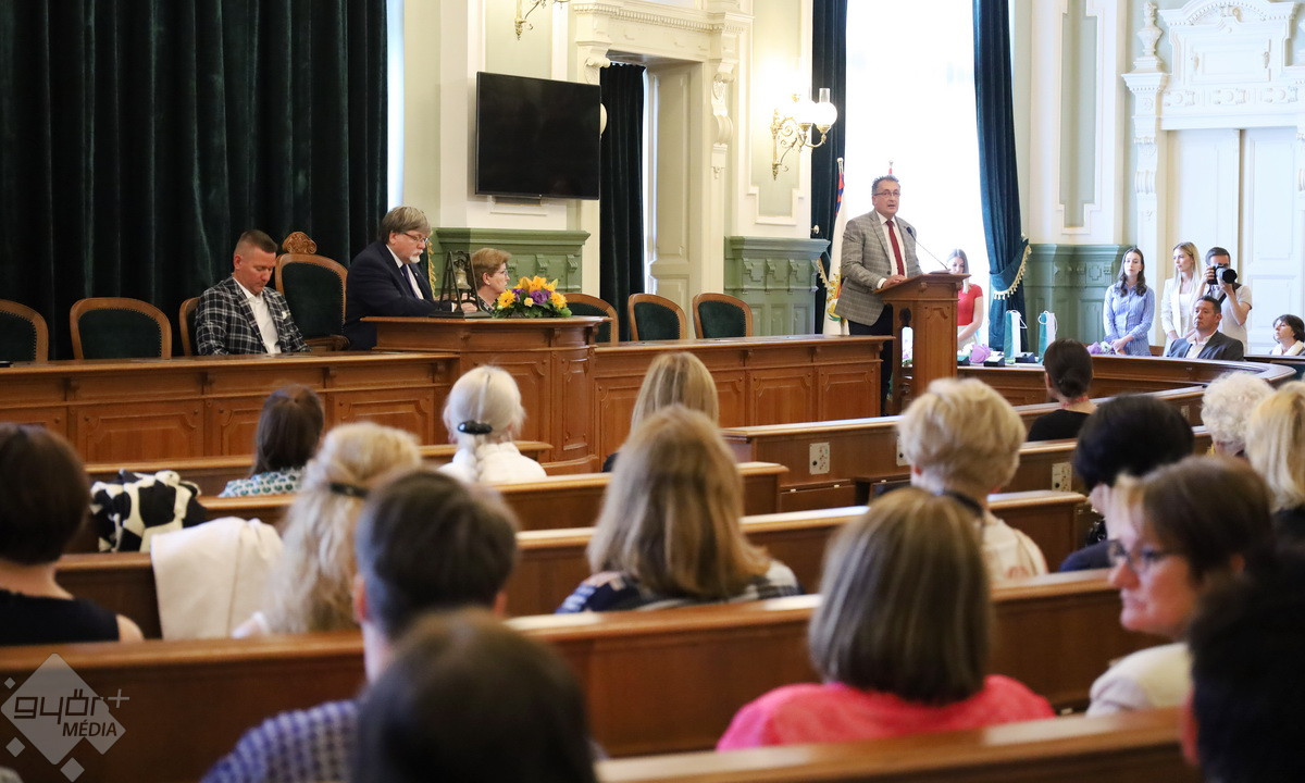 Dr. Dézsi Csaba András polgármester ünnepi köszöntőjében kiemelte, hogy Győr iskolavárosként nem csak a múltban, hanem a jelenben is fényesen teljesít, több intézmény is az élvonalba tartozik országos viszonylatban. A polgármester beszélt arról is, mekkora felelőssége van a pedagógusoknak, az edzőknek abban, hogy jó embert faragjanak a gyerekekből. Megköszönte a tanárok munkáját, azokét, akik felnevelik a jövő generációját. „Mert a mai diákokon múlik Győr város jövője, az, hogy milyen városban élhetünk, és hogy Győr megtartja-e az ipari szerepét, azt a szerepet, amit ma már kiegészít az egyetem, az innováció. Rajtuk múlik, hogy a város megtartja-e sikerét a kultúra, a gazdaság, az oktatás, a sport és egyéb más területeken is. Vajon lesznek e folytatói ennek a színvonalnak, mert az elvárás ez.” – hangsúlyozta a polgármester. Majd virággal köszöntötte egykori tanárait: Truka Istvánné Katona Zsuzsannát, Németh Gyulánét és dr. Haffenscherné Géczi Zitát.