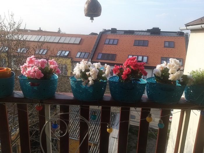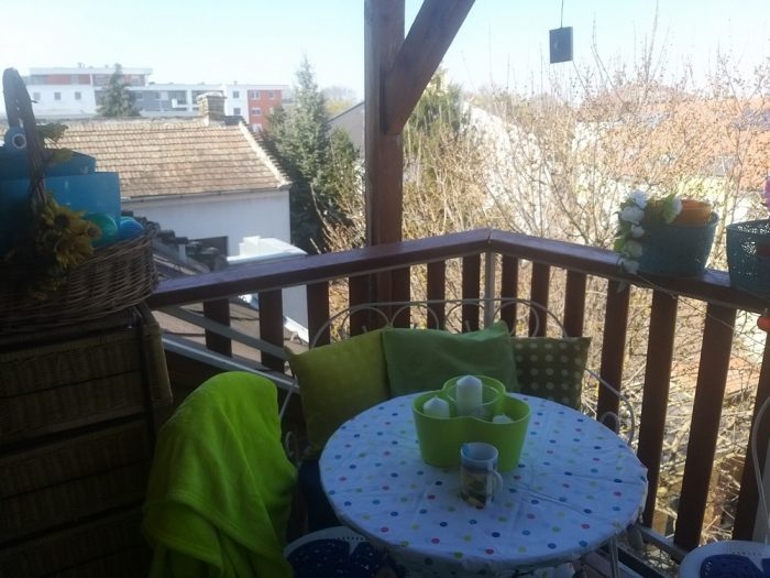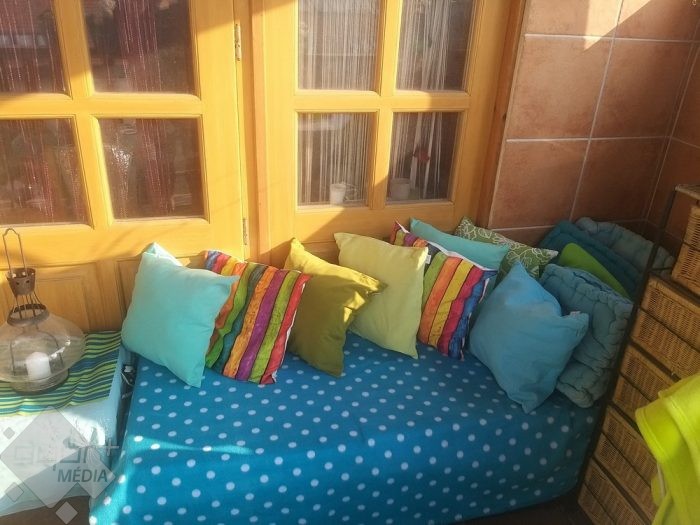 Apropó! A teraszom is nagyon kedvemre való lett! Összeszedtem az összes színes párnahuzatot, pöttyös takarót, világító füzéreket, s tavaszi jelmezbe öltöztettem a teraszt. Nem egy Négyszögletű Kerek Erdő, de napsütötte délutánjaim kávéillatú munkahelye.