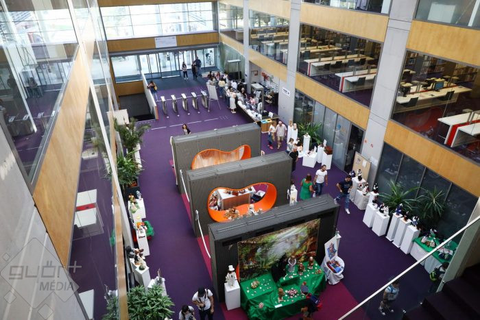 Az alagsorban és a földszinten 250 darab számítógép és tanulószobák várják a hallgatókat. Ezeket be lehet csukni és egyéni, illetve csoportos tanulásra is igénybe vehetők. Természetesen saját laptoppal is lehet jönni. Az alagsorban még egy gyerekkuckó található, s amíg a szülő vizsgázik vagy tanul, addig az apróságok ott játszhatnak. Sőt, egészen pici babákat is hozhatnak, mert pelenkázó, illetve szoptatóhelyiség is rendelkezésre áll. A gyerekkuckóban óvodás és kisiskolás csoportoknak tartunk foglalkozásokat és nyári tábort. A második emeleten helyezkednek el a kutatószobák és a médiaboxok. Így a teljes teret kihasználjuk”. – hangsúlyozta Tóth Csilla.