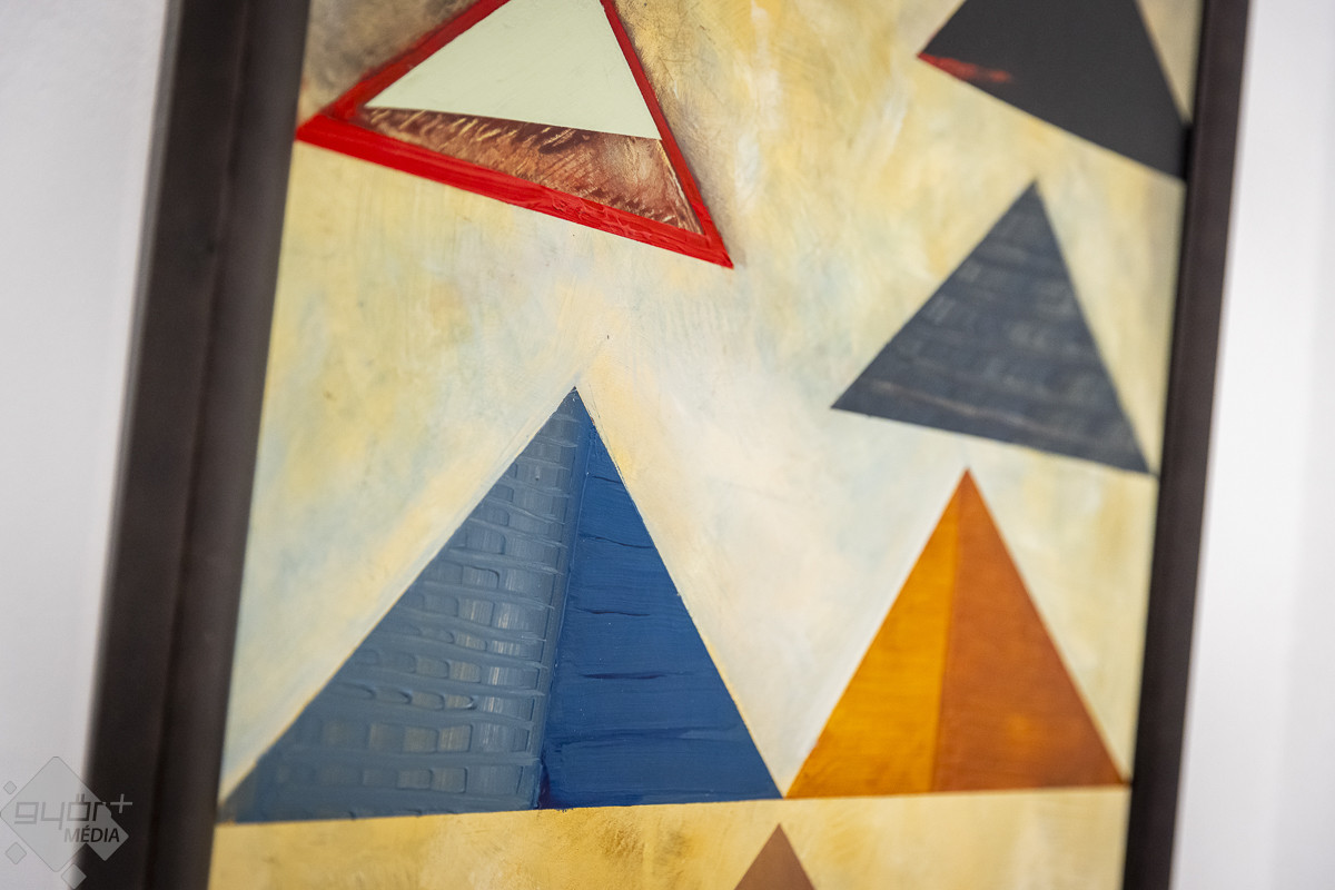 „Megpróbálok a színhasználatban és dekonstrukcióban is olyan új geometriát alkotni, amely a hagyományokon alapul, de mégis más, a kortárs szemléletvilágba illeszthető. Azt mutatom meg, hogy lehet a geometriát úgy bemutatni, hogy az a ma emberének is mondjon valamit. Azt, hogy ne csak egyszerűen mértani formákat lássanak a szemlélők a képeken, hanem hangulatot, erőt, utalást. A képeim egy részén vannak utalások, például a piramis sorozatom ilyen. Az absztrakt művészetben mindig valami történetet keresnek az emberek, egy klasszikus geometria azonban nem sok mindenről mesél. Én most ezzel próbálkozok, egy sajátos geometriát megalkotni. Egyelőre elég jók a fogadtatásai.”- mondta portálunknak az alkotó.