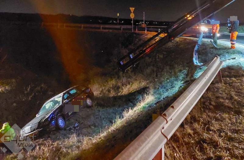 Hétfő este a győri keleti elkerülőn (813-as főút) egy Mercedes vezetője nem észlelte időben a körforgalmat.