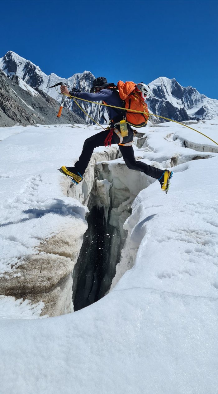 Ami a fotón látszik, az messze a komfortzónán túl van. Ott, abban a pillanatban kellett eldönteni, hogy bevállalom-e az ugrást. Alattam ki tudja, milyen mélység volt, éles-jeges sziklák és sorolhatnám. Viszont tudtam, hogy a testemre erősített kötél végén ott áll a társam, aki fogja, és ha bármi történne, nem engedné, hogy bajom legyen. Meg kellett próbálni, mert csak így juthattam át a túloldalra.
