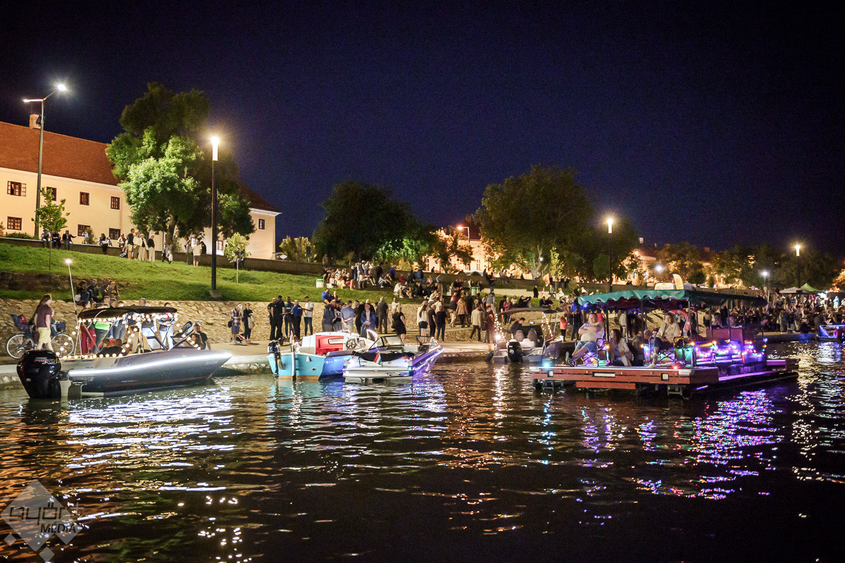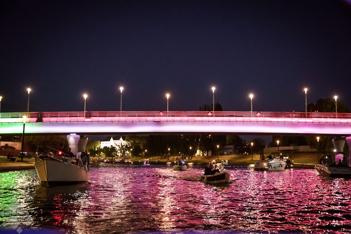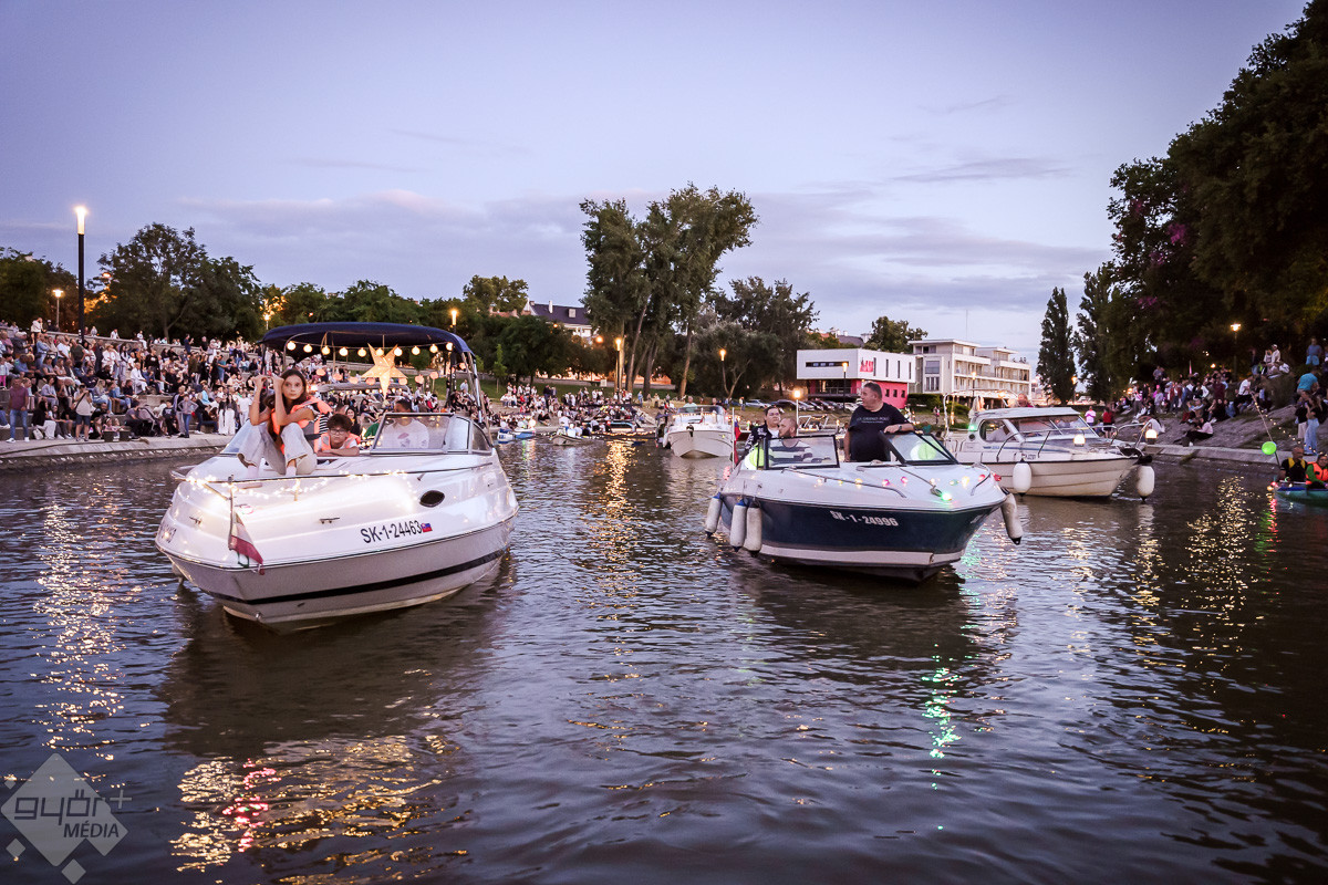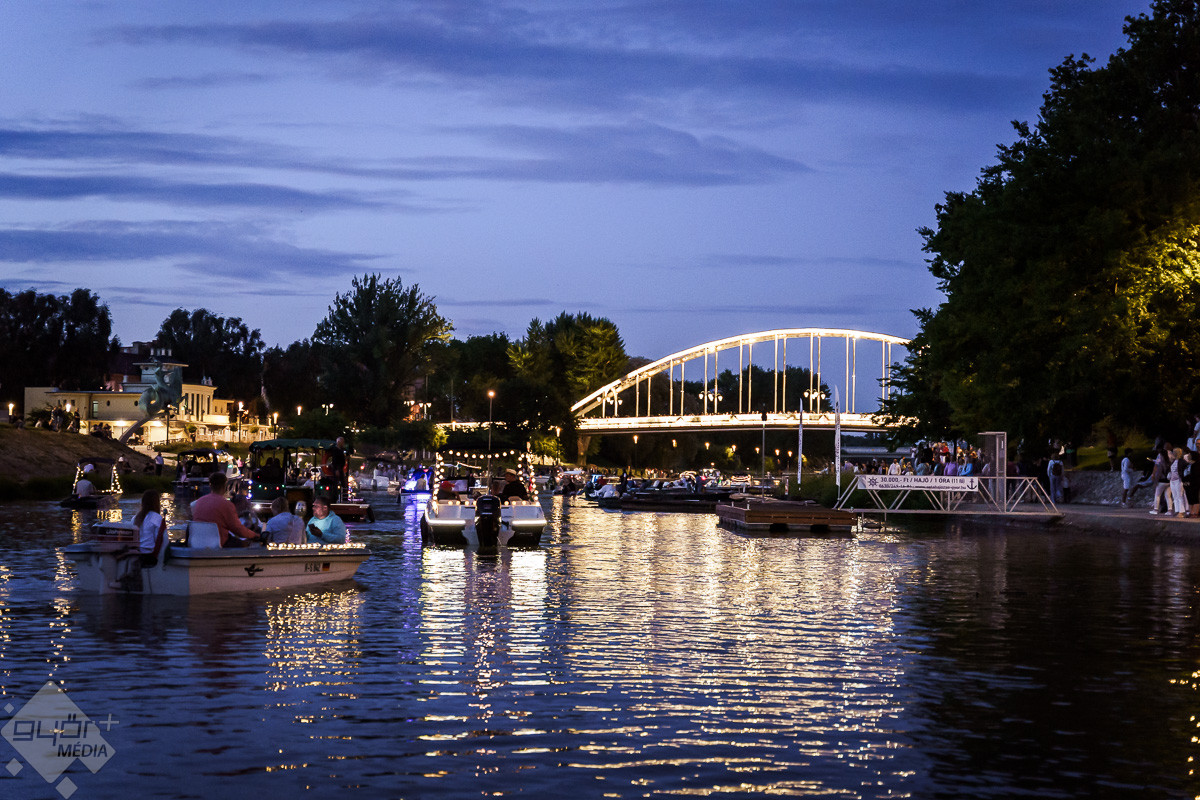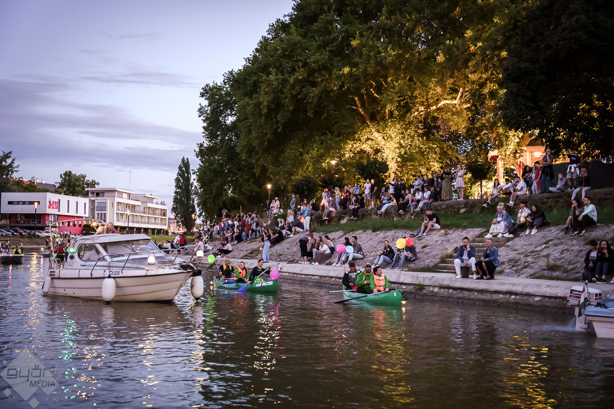 A különleges eseményen közel 100 kivilágított vízi jármű – csónakok, kajakok, sárkányhajók és kisebb motorcsónakok – szelte a habokat, mindenféle színes fényekbe és díszítésbe burkolva.