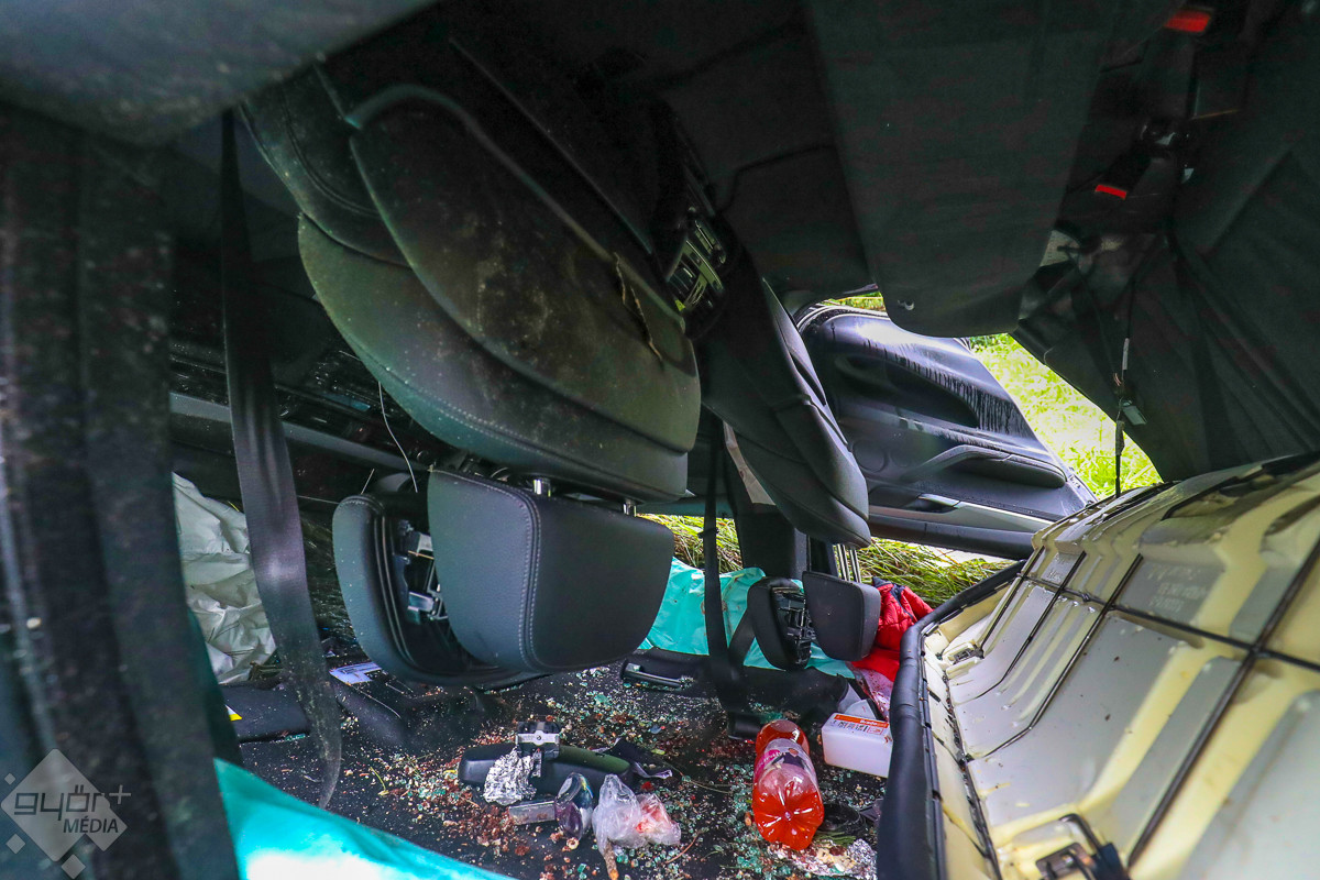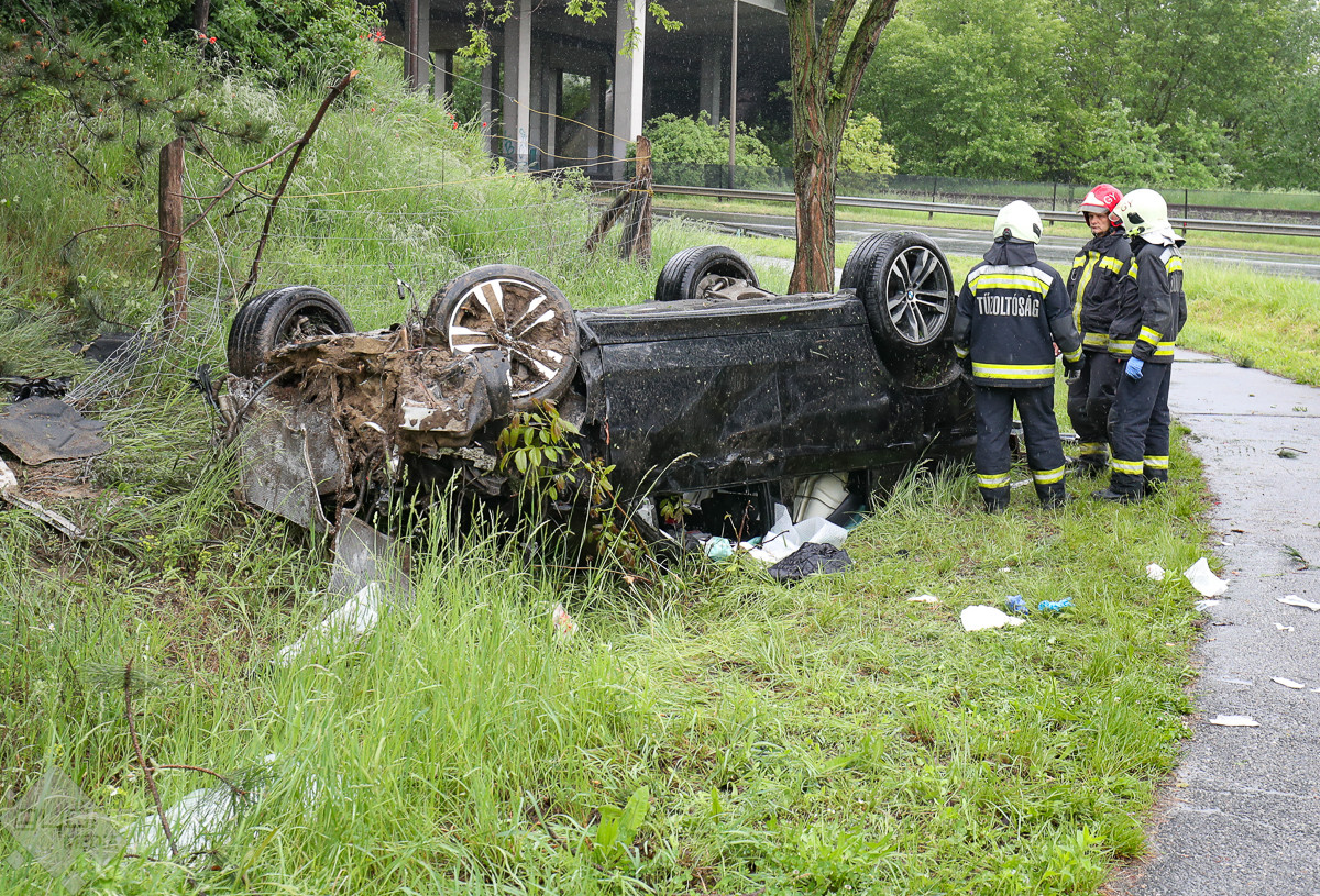 Lezuhant egy személyautó az M1-es autópályáról Győrben, és a tetejére borulva a Királyszéki úton állt meg. A győri hivatásos tűzoltók áramtalanítják a járművet. A balesethez a mentők is kiérkeztek.