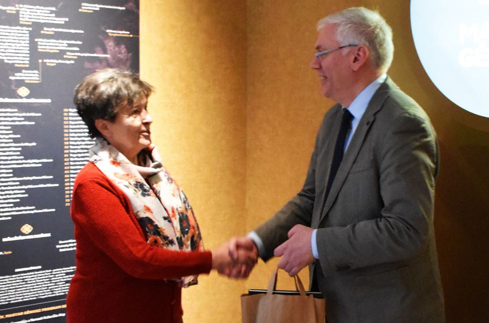 Székely Zoltán, a Rómer Múzeum igazgatója ajándékkal kedveskedett a meglepett hölgynek.