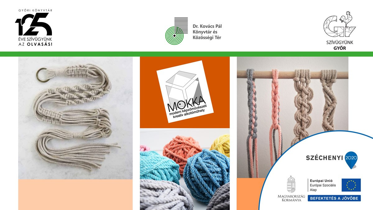 2022. október 21-én (pénteken) 16-tól 19 óráig a Dr. Kovács Pál Könyvtár és Közösségi Tér József Attila Művelődési Házában (9028 Győr, Móra Ferenc tér 1.) a MOKKA Felnőtt Kézműves Műhely tagjainak segítségével megismerkedhetnek a makramé technikával.