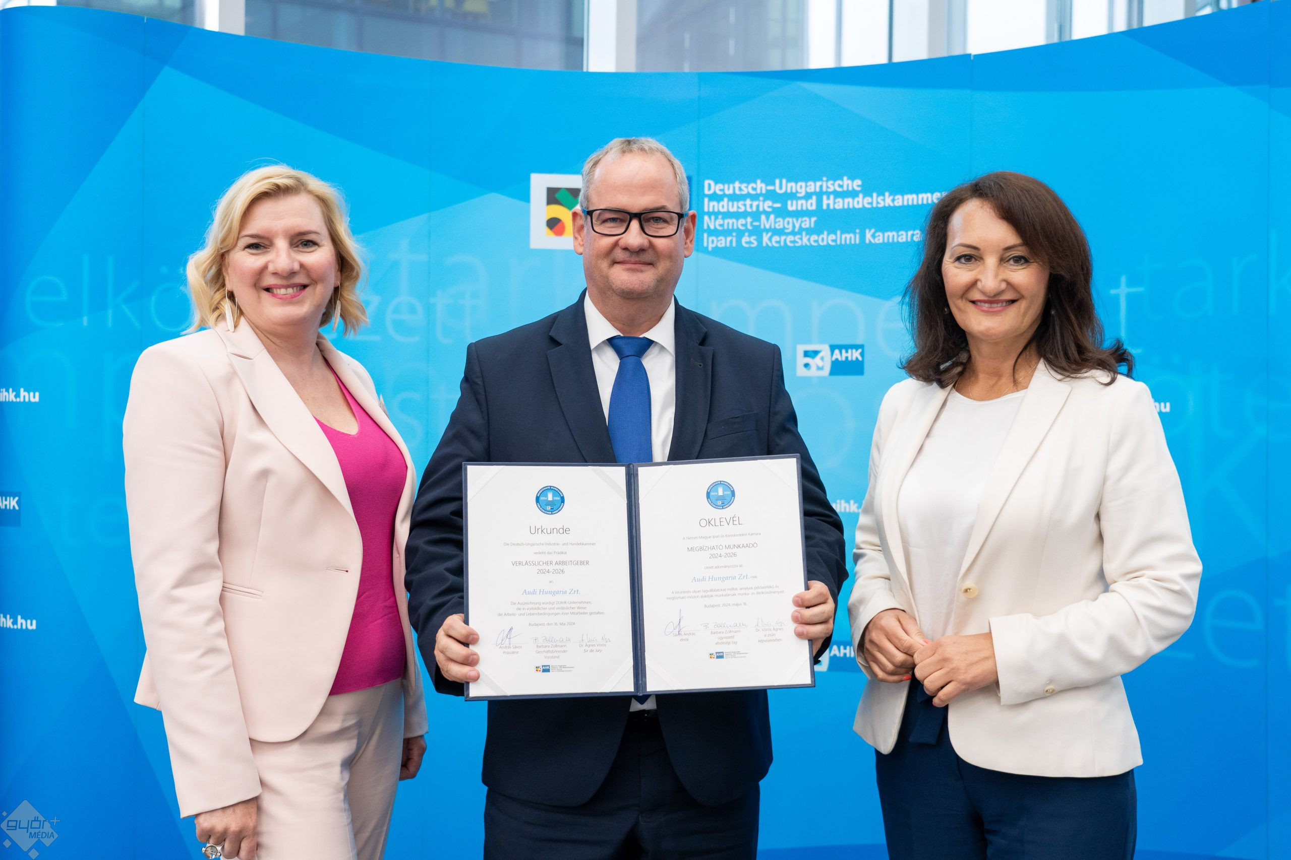 A Német-Magyar Ipari és Kereskedelmi Kamara (DUIHK) immár hetedik alkalommal adta át a Megbízható Munkaadó díjakat. A „Megbízható Munkaadó 2024/26” címmel olyan vállalatokat ismernek el, amelyek példamutató módon gondoskodnak alkalmazottjaik munka- és életkörülményeiről. A díjat az Audi Hungaria képviseletében Németh Kinga, az Audi Hungaria személyügyért és szervezetért felelős igazgatósági tagja és Czechmeister Mónika, a vállalat employer branding/belső kommunikáció vezetője vették át.