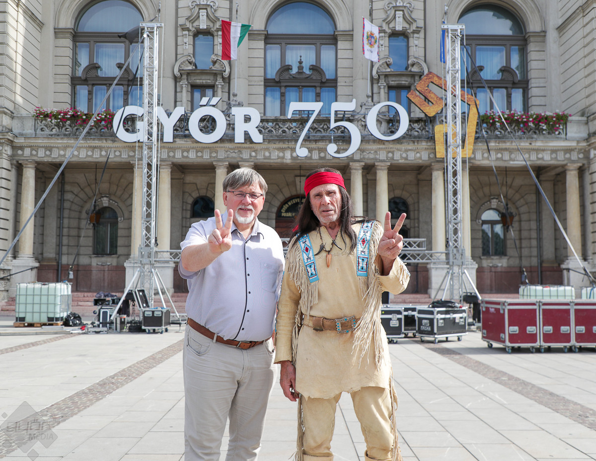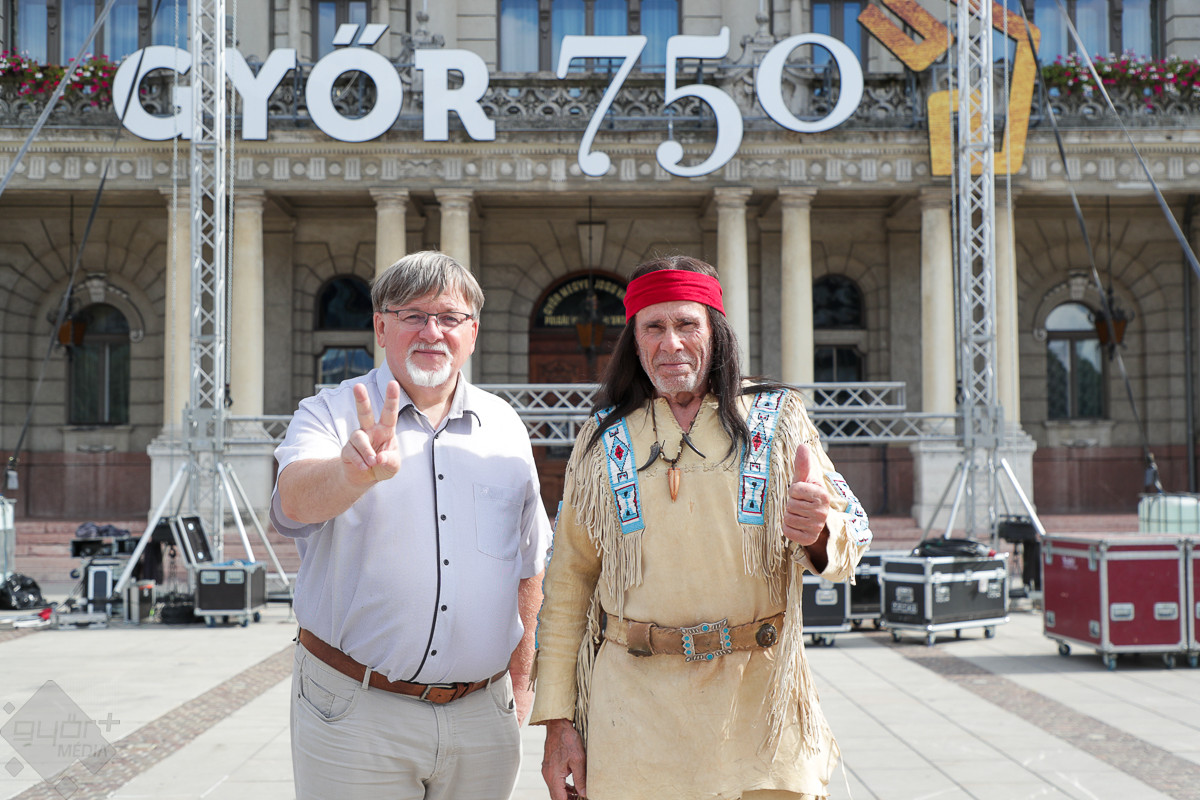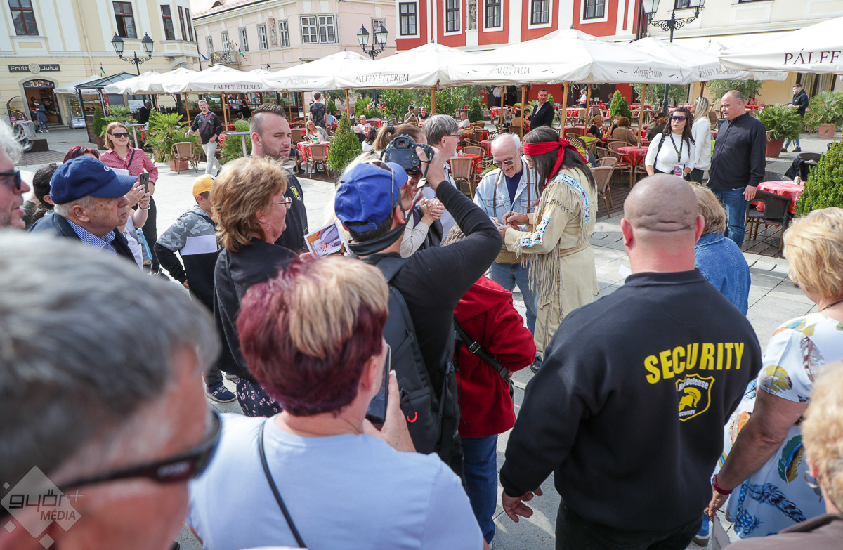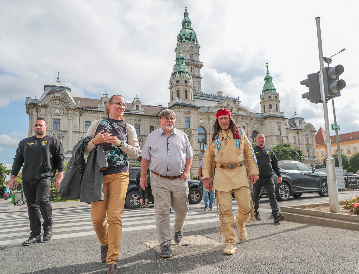 Gojko Mitic jelenleg 81 éves, ám az indián jelmez és paróka alapján akár 30 évet is letagadhatna. A színész először a Városházán tett látogatást, majd Dr. Dézsi Csaba Andrással együtt sétáltak végig a Baross úton, már ekkor több rajongó fotózta a sztárt és a polgármestert, akiket a Széchenyi téren hatalmas tömeg fogadott.