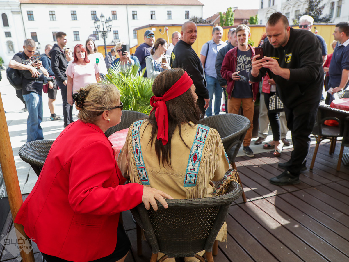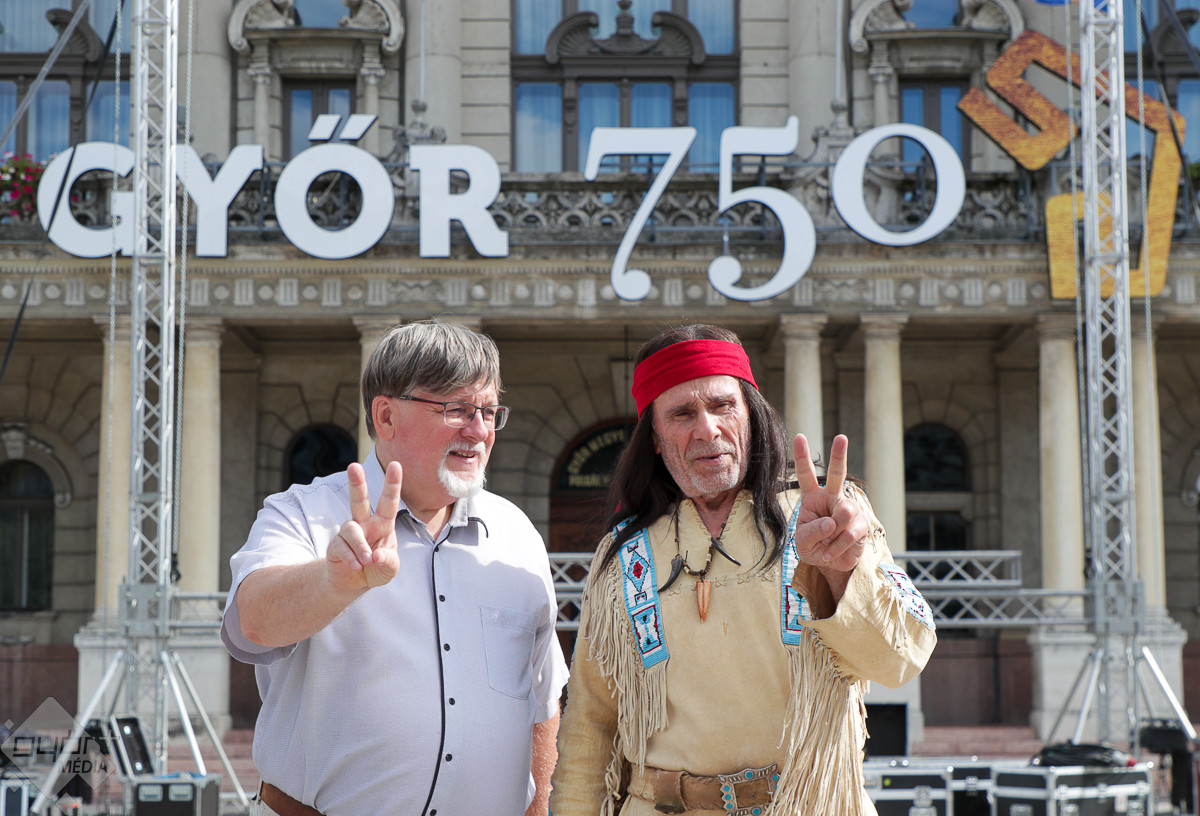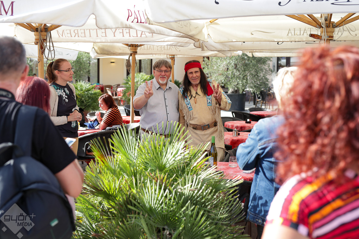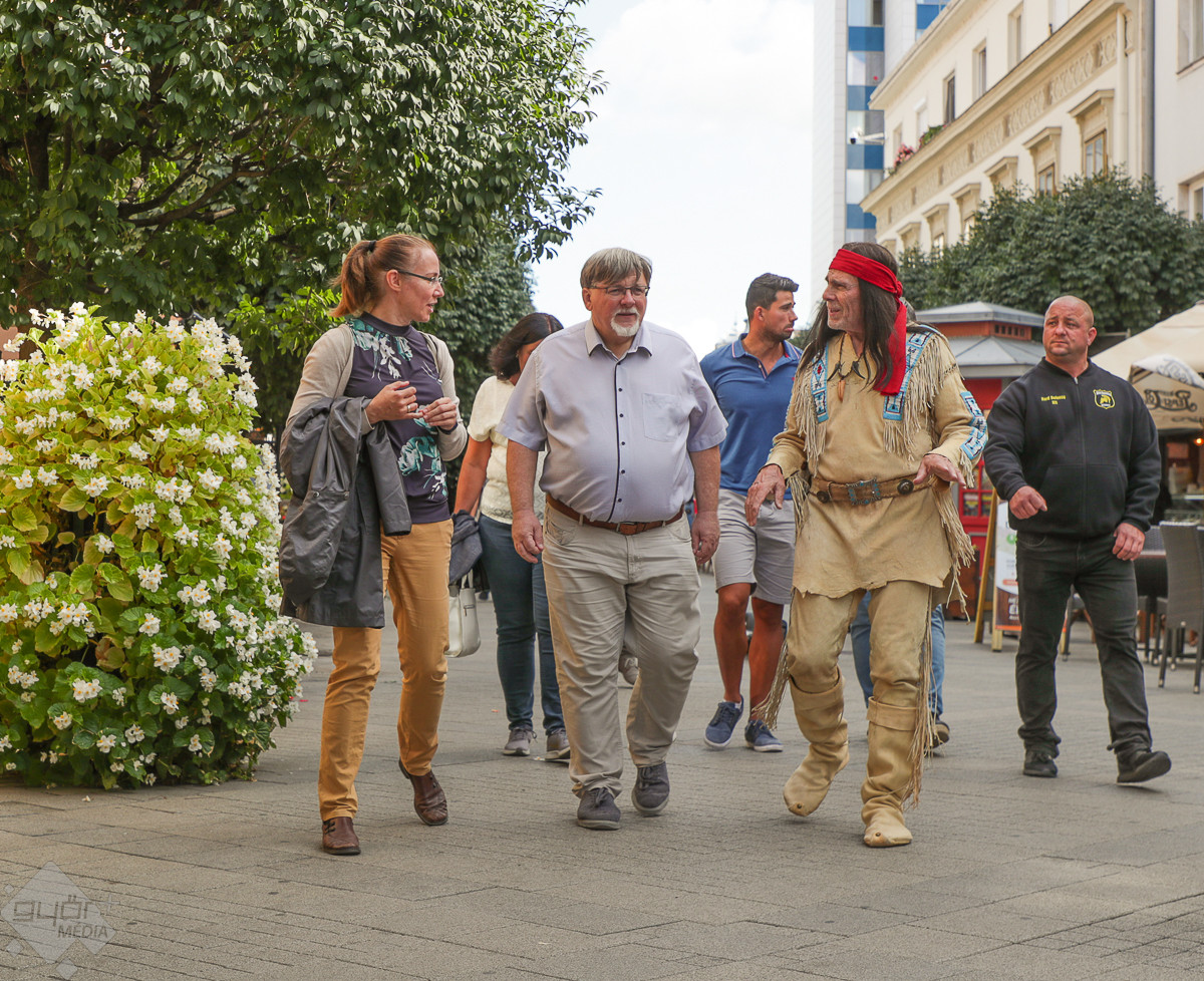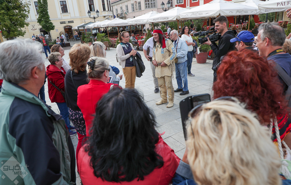 Gojko Mitic jelenleg 81 éves, ám az indián jelmez és paróka alapján akár 30 évet is letagadhatna. A színész először a Városházán tett látogatást, majd Dr. Dézsi Csaba Andrással együtt sétáltak végig a Baross úton, már ekkor több rajongó fotózta a sztárt és a polgármestert, akiket a Széchenyi téren hatalmas tömeg fogadott.