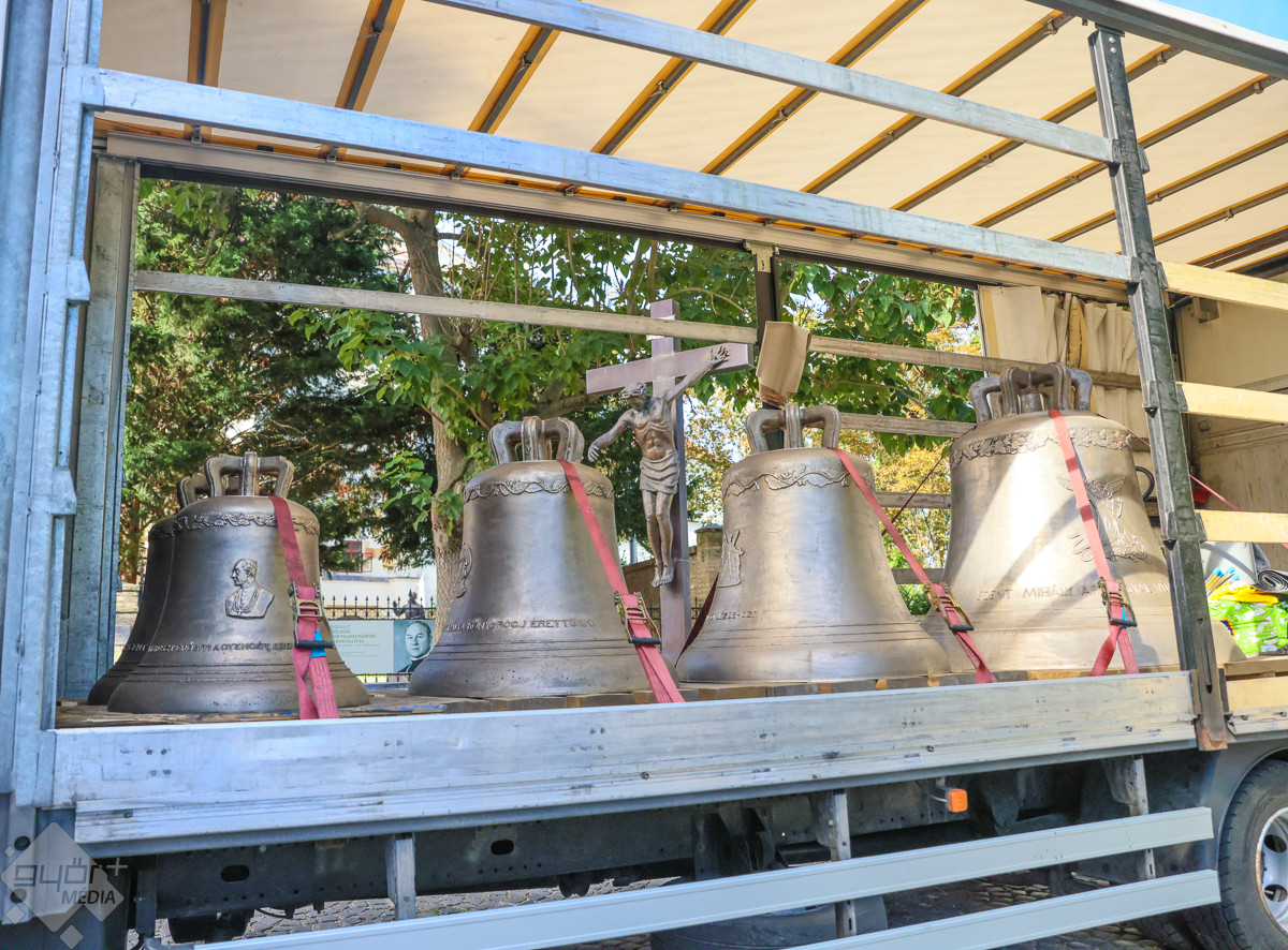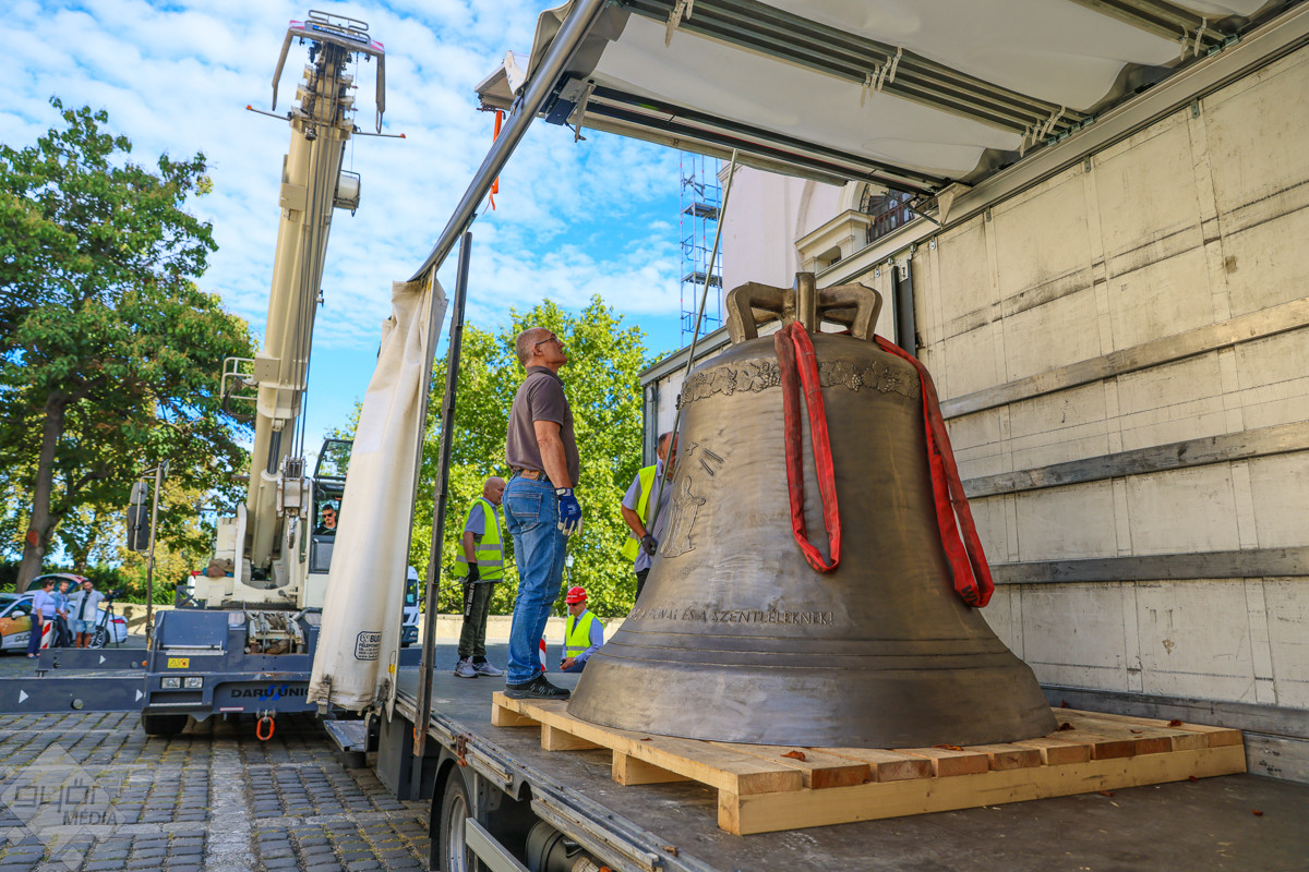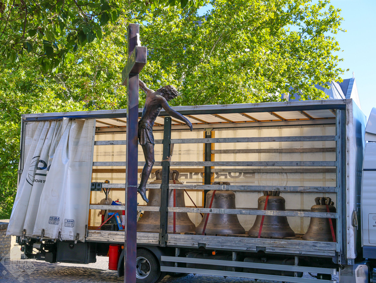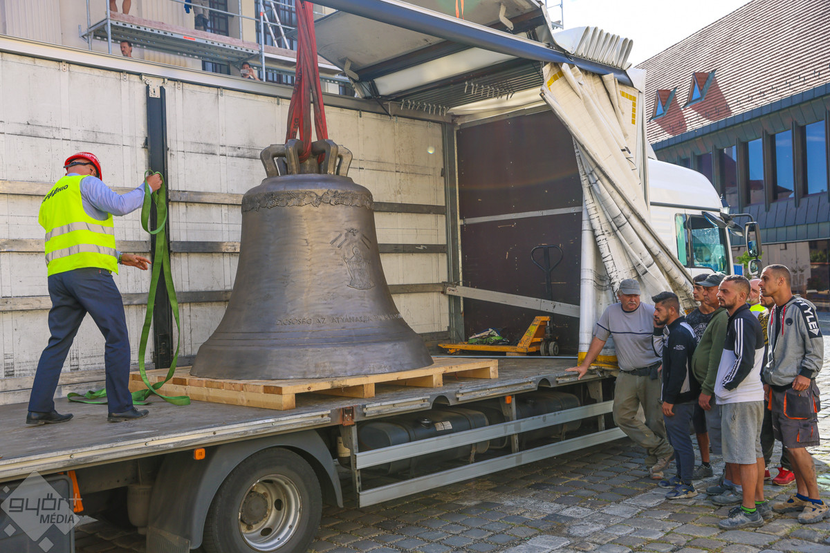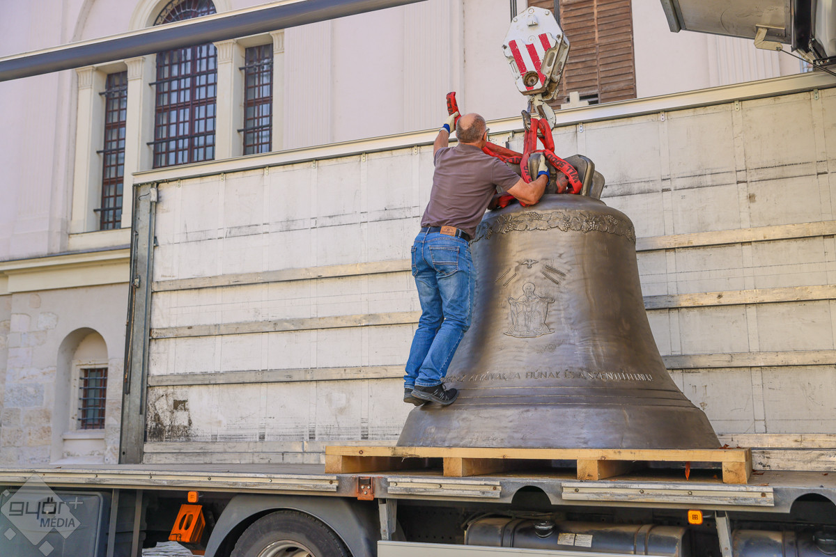 Az első teherautóban egyedül utazott a Szentháromság nevére keresztelt legnagyobb hangszer. A több mint négy tonnás tárgyat daruval emelték le a járműről. Ezután a második kamion rakománya, az öt kisebb harang következett.