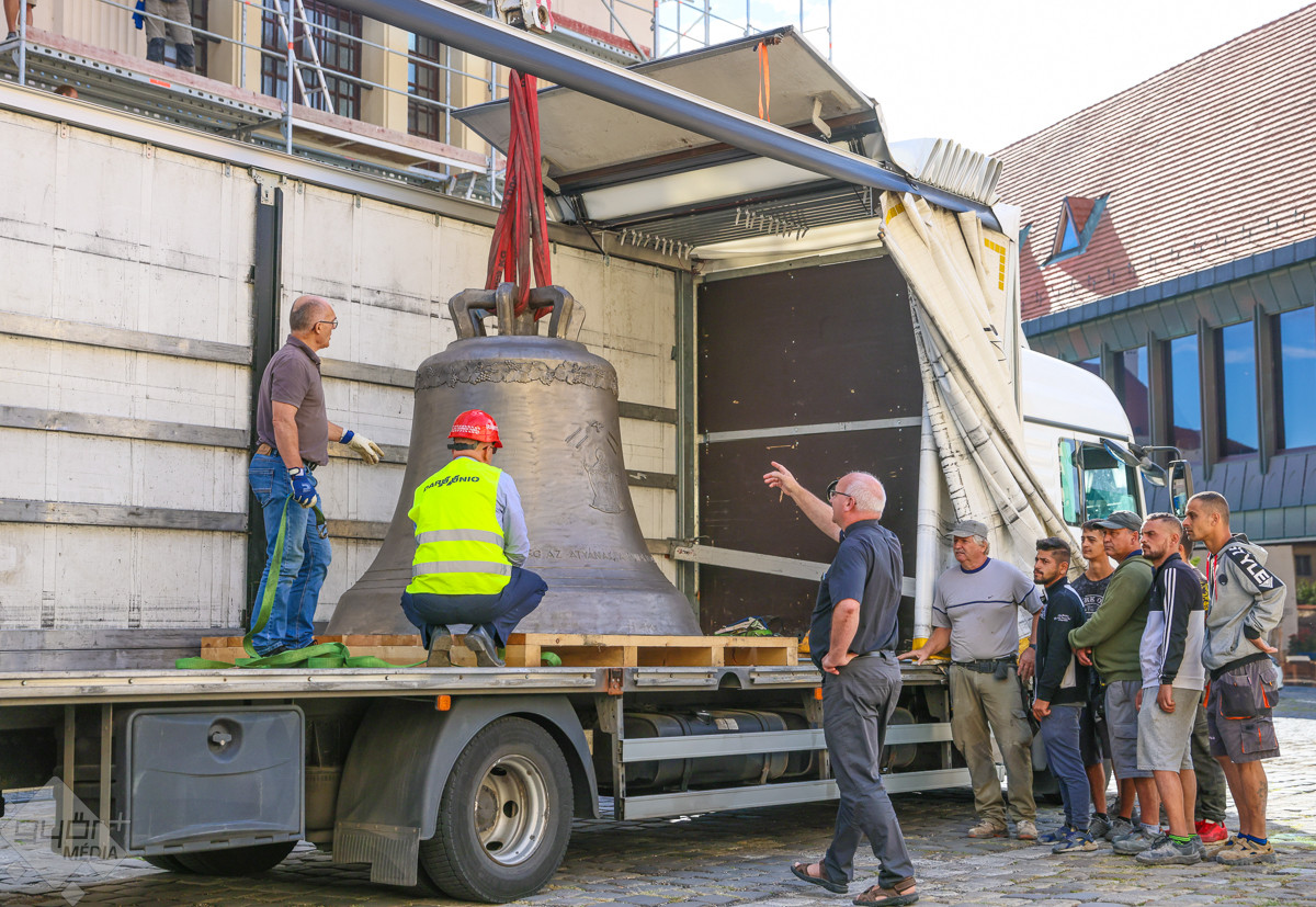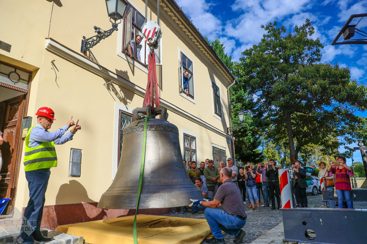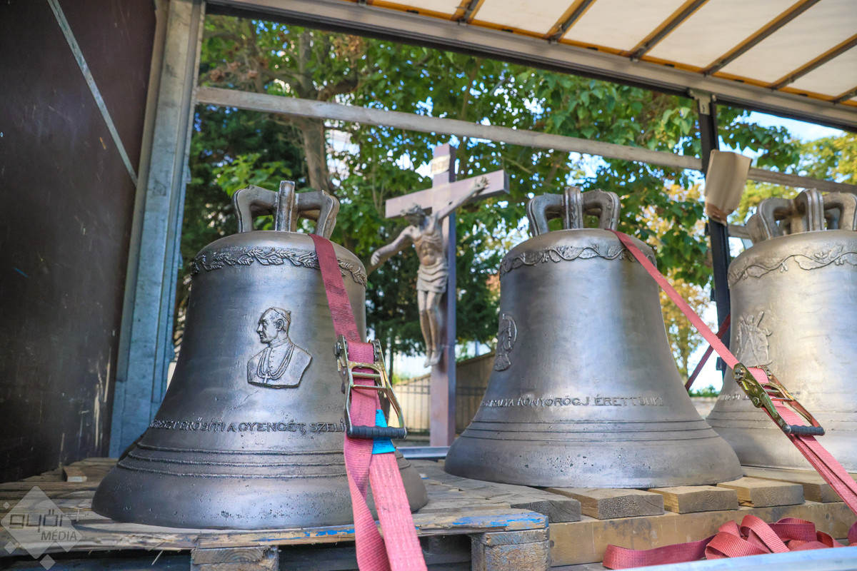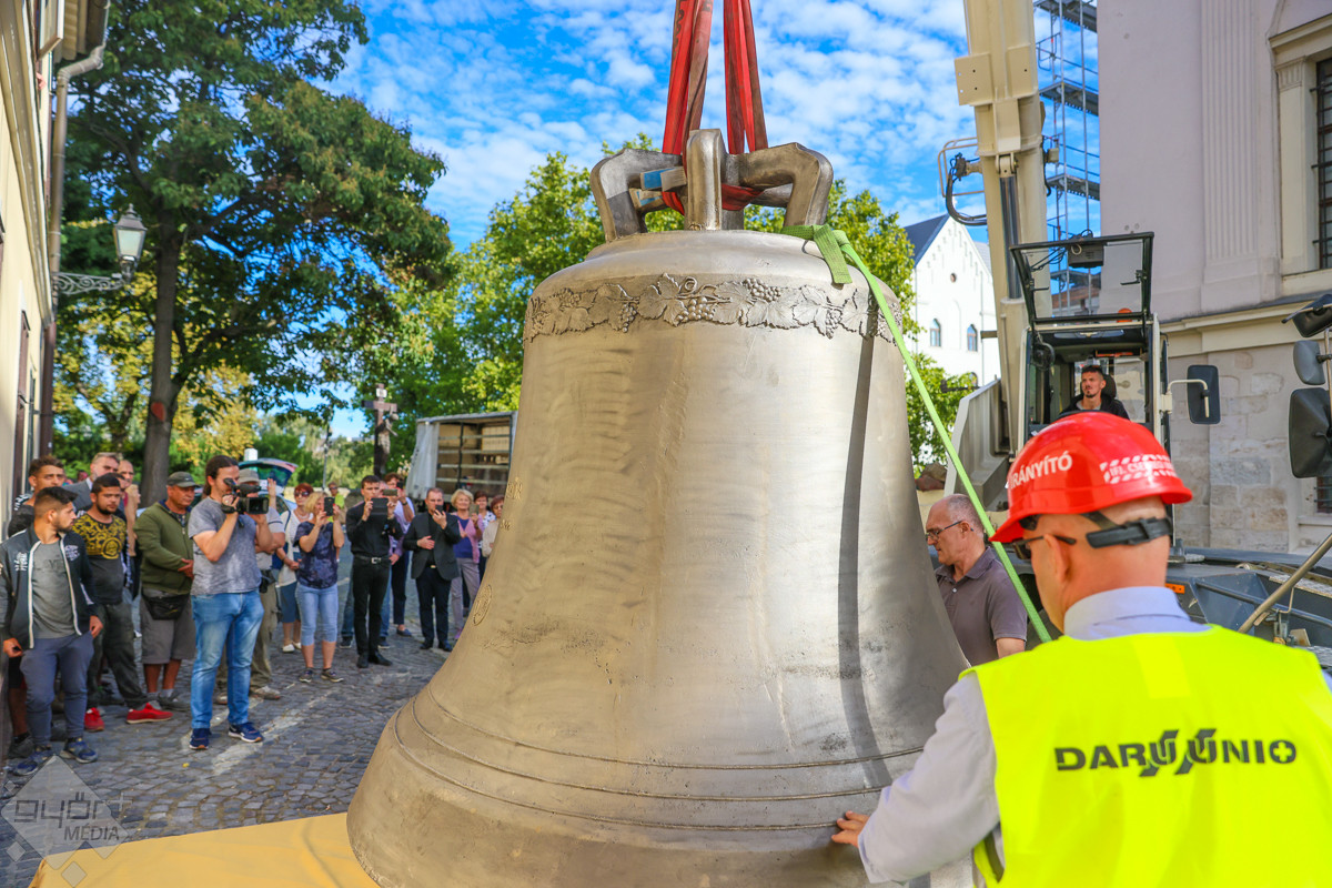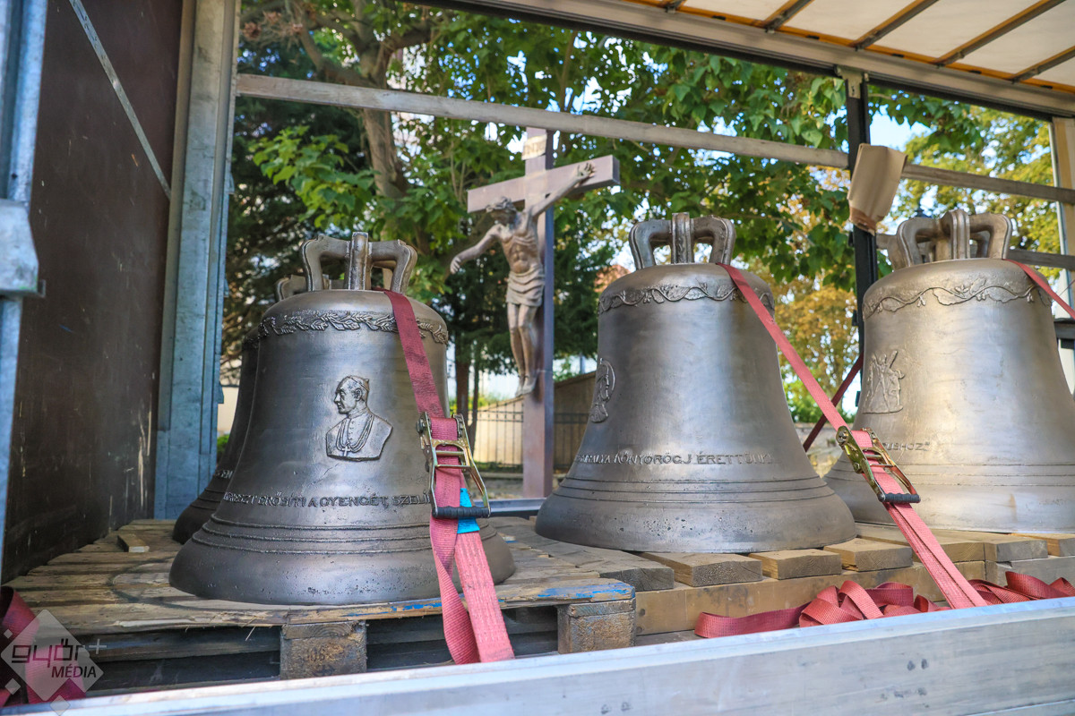 Az első teherautóban egyedül utazott a Szentháromság nevére keresztelt legnagyobb hangszer. A több mint négy tonnás tárgyat daruval emelték le a járműről. Ezután a második kamion rakománya, az öt kisebb harang következett.