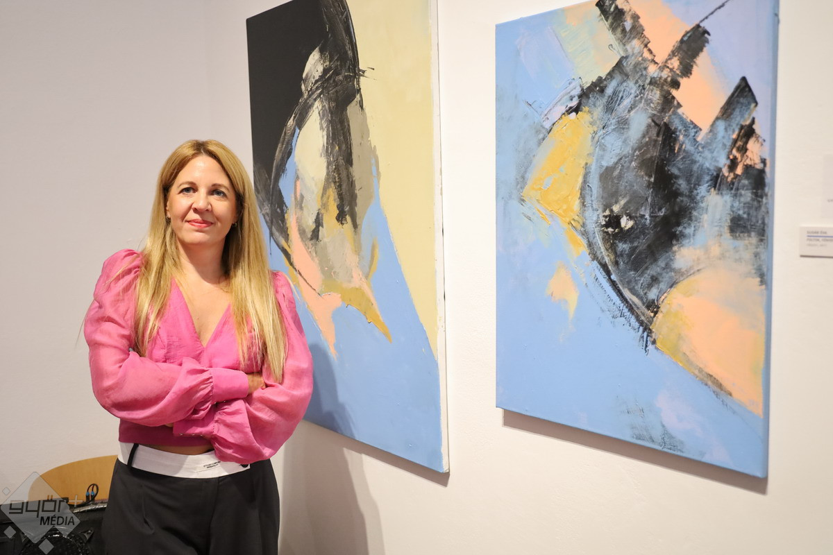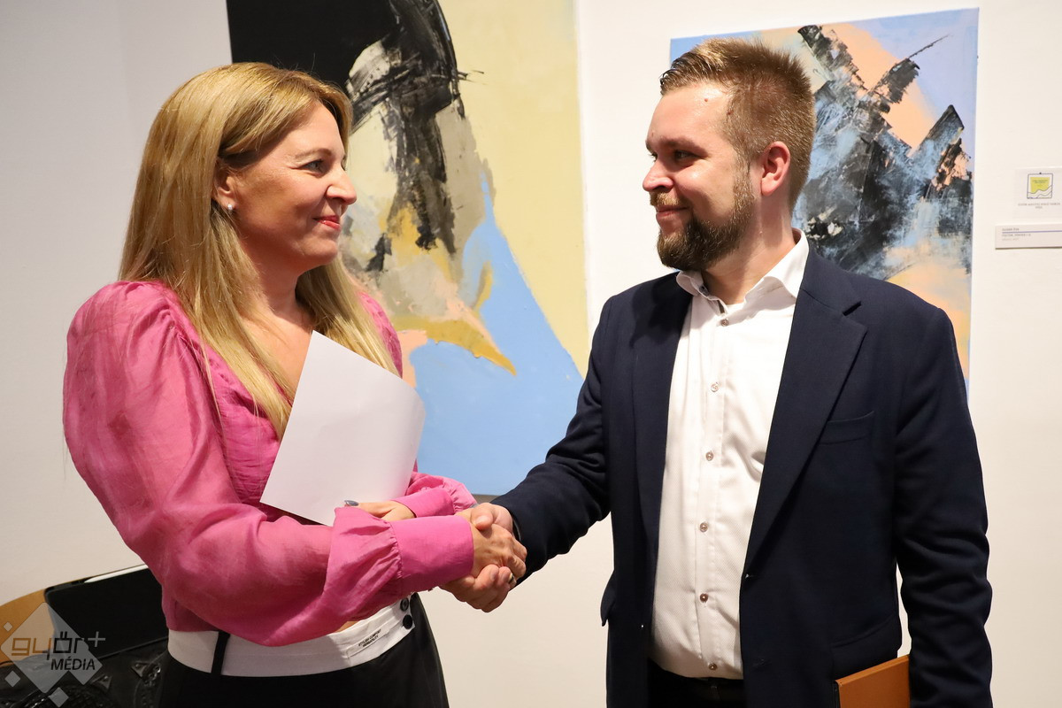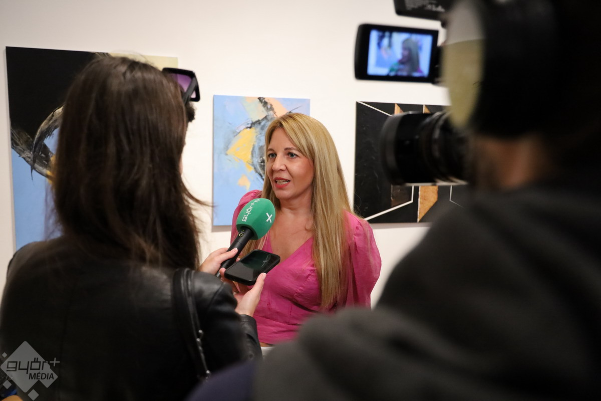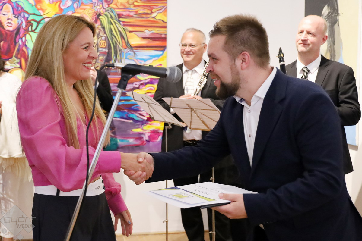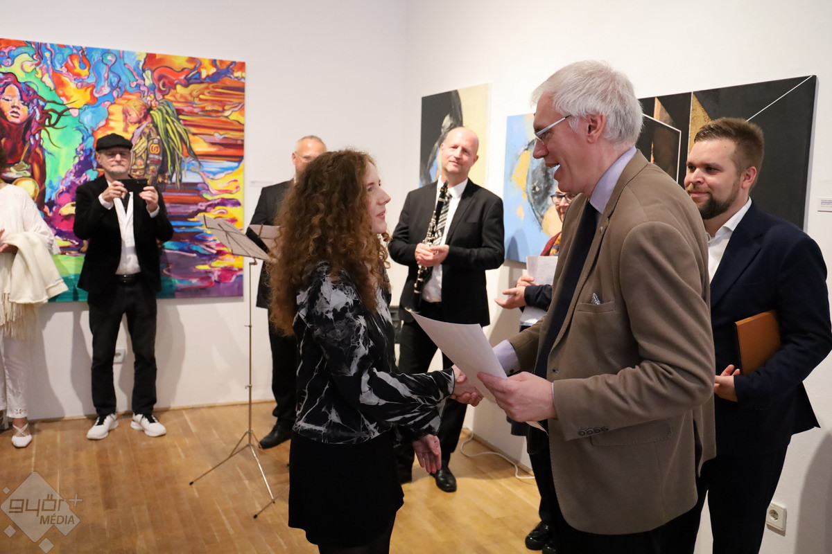 Győr Megyei Jogú Város díját Sudár Éva, festőművész vehette át a polgármestertől. “Ezek annyira friss képek, hogy két hete készültek, akkor volt az Art Flexum Művészeti Társaságnak, aminek én is tagja vagyok, egy művésztelepe Rajkán a legnagyobb árvíz közepén. Ott készültek ezek a képek. Nagyon rossz idő volt az első három napban, ráadásul bent voltunk egy kisebb helyen. A hét első felében nagyon komor képeket csináltam, de ahogy a hét második felében kisütött a nap, én is kiszínesedtem, ezek a képek így készültek. Általában ekkora, vagy még nagyobb képeket készítek, nagy gesztusokkal dolgozom. Az elismerés nagyon-nagy meglepetés volt és hatalmas megtiszteltetés, ez messze a legnagyobb díj, amit elértem, ez hatalmas öröm számomra” – mesélte a művész.