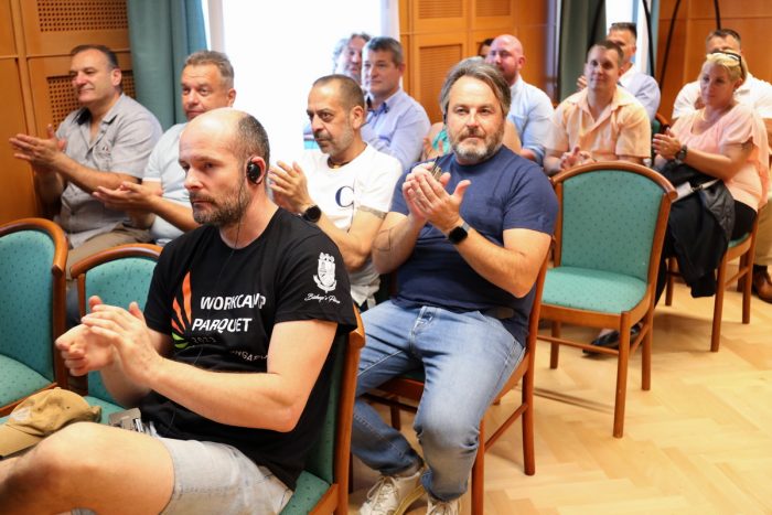 „ Csapatunk kizárólag mesteremberekből áll, sokan közülük harmadik, negyedik generációs művelői szeretett szakmájuknak. Restauráljuk, felújítjuk, megóvjuk a parkettát. Belga barátom például a belga királynő padlóját szokta restaurálni. Nagyon komoly szakemberek gyűltek itt össze. Hazánkban sajnos a parkettás szakma bajban van, mert képzés hiányában nincs utánpótlás. Ilyen típusú munkavégzést, ami most történt a püspöki palotában, senki nem tud Magyarországon csinálni. Harmincan vagyunk itt és 220 négyzetmétert újítottunk fel. Csak hagyományos módszerekkel és technológiával végeztük az állagmegóvást, a felületkezelést, javítást és restaurálást. Ahol már nem lehetett a régit megmenteni, mintegy 55 négyzetméteren teljesen új parkettát tettünk le.”