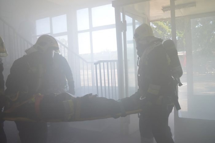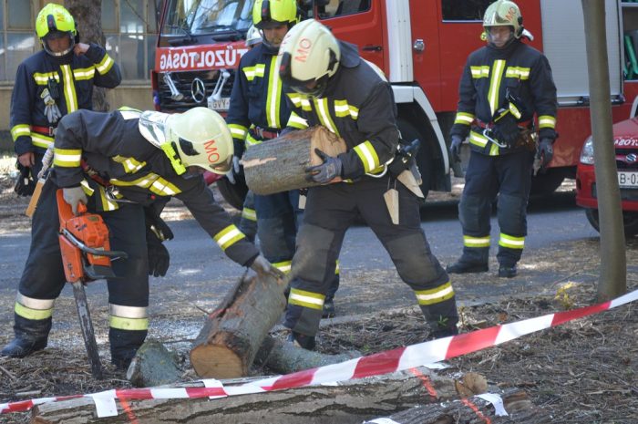 - A tűzoltási feladat is összetett volt. A feltételezés szerint egy többszintes irodaépületben – feltehetően dohányzás miatt – keletkezett tűz, amit egy ott lévő ember megpróbált eloltani, de a nagy füst miatt rosszul lett és az épületben rekedt. A tűzzel érintett épületben veszélyes anyagot is tároltak. A tűzoltóknak a tűz eloltása mellett több akadállyal is meg kellet küzdeniük. Az épület bejáratát egy kidőlt fa torlaszolta el, ezt kellett eltávolítani, feldarabolni. A bejárati ajtó zárja elromlott, a lépcsőfordulóban pedig egy korlát akadályozta a mentést és a tűz oltását. A veszélyes anyagot is be kellett azonosítaniuk, valamint a létszámot is ellenőrizniük.