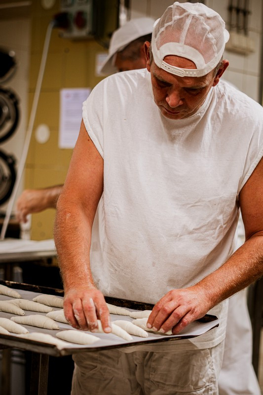 Három jól elkülöníthető, szinte külön szakma tevékenykedik együtt a pékségen belül: a folyamatot a dagasztó kezdi, ő az, aki 3-4 órakor nekifog a tészta elkészítésének. Utána a táblamunka következik, ahol formázzák a termékeket. Végül a kisütő az, aki a megfelelő időben behelyezi, majd kiveszi a kész termékeket a sütőből.