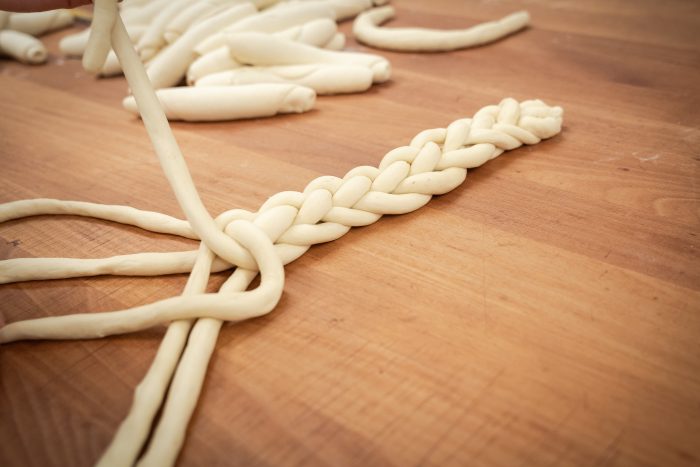 - Egy gyúrólapot belisztezünk, és a megkelt kalácstésztát 3 egyenlő részre osztjuk, majd egyenként kb. 30 centi hosszú rúddá hengergetjük. Ezeket egymás mellé fektetjük, a végüket összenyomjuk, a szárakat – mint egy copfot – befonjuk.