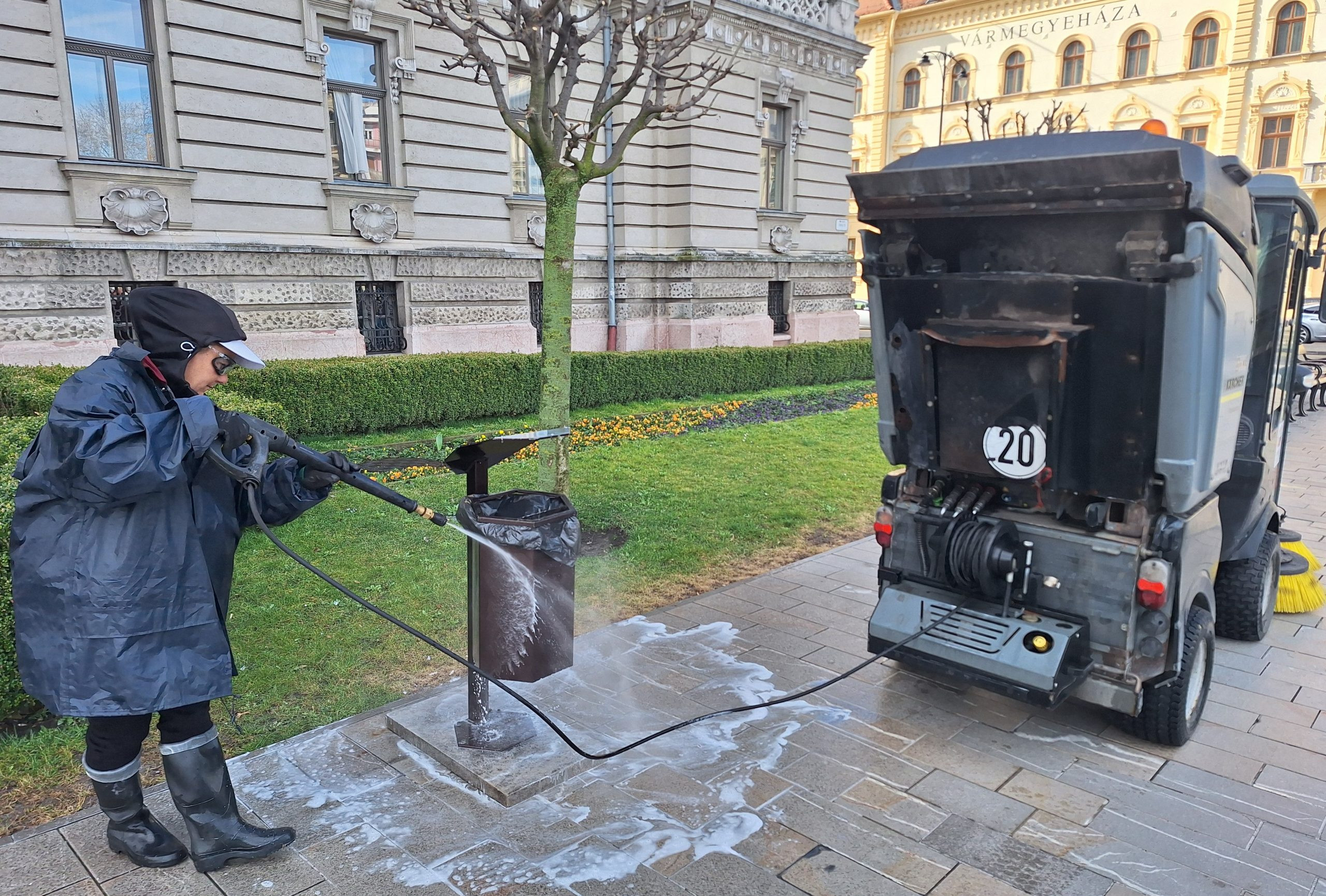 Az ürítés mellett időről időre le is mossák az edényeket (a város területén több száz ilyen található), ezekben a napokban nagy nyomással, fertőtlenítős-mosószeres vízzel mossák a csikktartókat, valamint a közelükben lévő padokat, székeket.