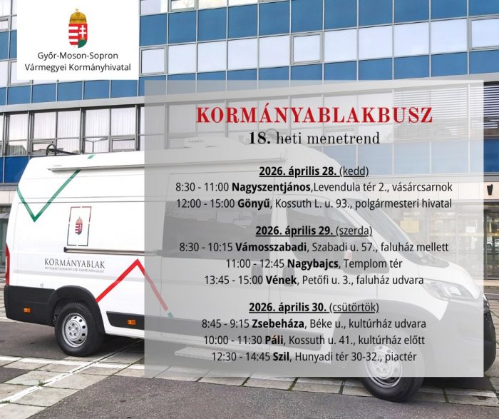 A Győr-Moson-Sopron Vármegyei Kormányhivatal Győr-Moson-Sopron Vármegyei Kormányhivatal mobil ügyfélszolgálata, a Kormányablakbusz 2026. április 28. és április 30. között több településen is elérhető lesz, megkönnyítve a lakosság számára az államigazgatási ügyek helyben történő intézését.