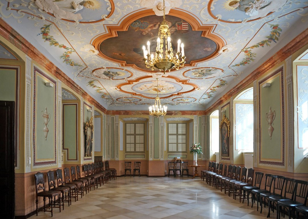 Az 1830-as években a bencés rend átalakította az ebédlőtermet, ekkor a kor divatjának megfelelő klasszicista elemekkel díszítették a falakat. Az ablakok közötti falakon festmények nyomaira bukkantak a restaurátorok. Ezek a képek a jezsuitákat támogató nemeseket ábrázolhatták.