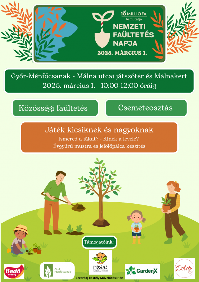 Helyszíne: Győr-Ménfőcsanak, Málna utcai játszótér és Málnakert (közösségi kert) Időpontja: 2025. március 1. 10:00-12:00 óráig. Két fő jelszavunk: Nem csak fákat, gondolatokat is ültetünk! Gyere, ültess velünk!