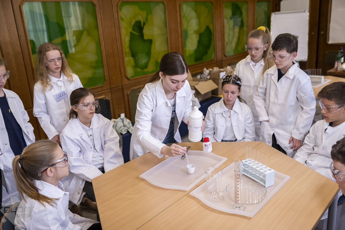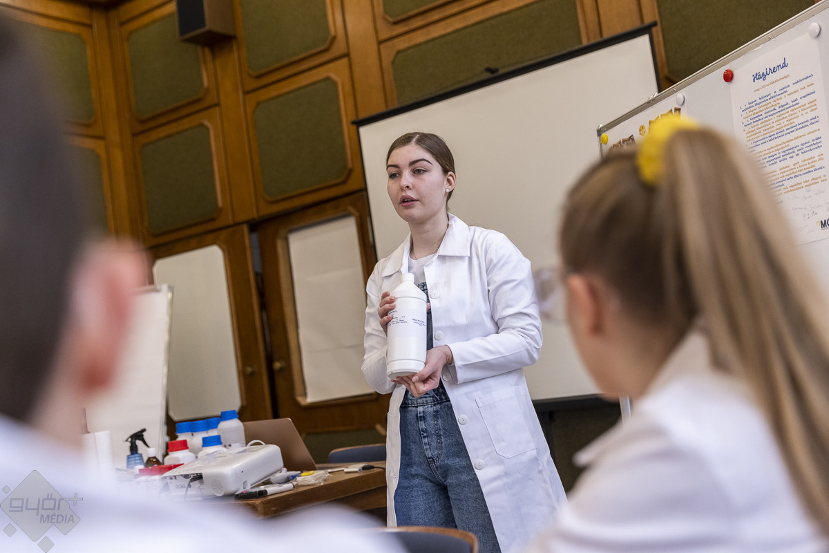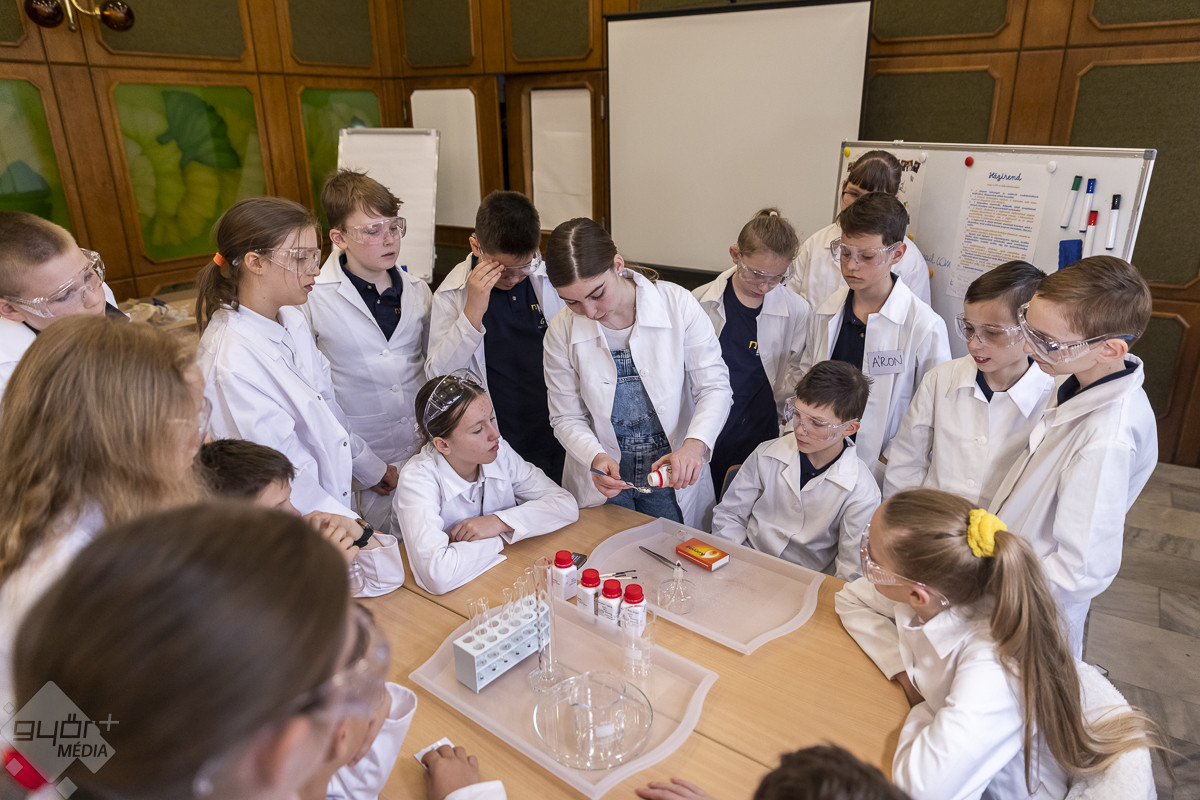 Miri elsőként hevítési próbákat mutatott be, majd az illusztrálta, hogy a különféle sók, hogyan színezik el a tüzet. A nap folyamán még „elefánt fogkrémet” is készítettek közösen. „Úgy vettem észre, hogy a gyerekeknek nagyon tetszenek a kísérletek, az eszközök, amivel végrehajtjuk őket. Érdeklődők, figyelnek, itt sokkal szabadabban tudják követni a bemutatókat, mint az iskolai órákon. Házi feladat, számonkérés nincs, de a diákok az e-lerning rendszerben megválaszolhatják a foglalkozáshoz tartozó kérdéseket, valamint otthoni kísérletek is végrehajthatnak, amikkel gyakorolhatnak és fejlődhetnek.” – hangsúlyozta Mercs Miriam, aki jelenleg egy balatonfüredi gyógyszertárban dolgozik, de szeretne továbbtanulni gyógyszerésznek.