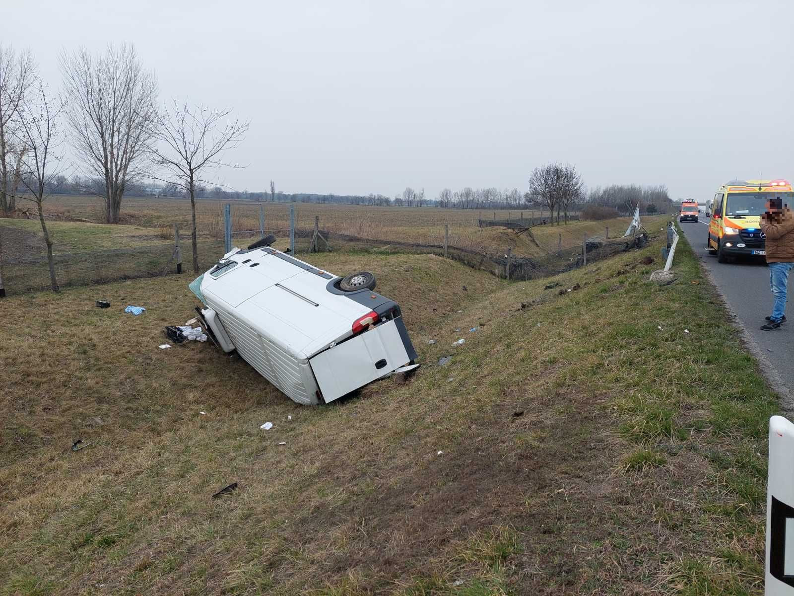 Helyszíni információink szerint a magyar furgon vezetője elaludt a volánnál, ezért haladt le az autópályáról, a vadkerítésbe csapódott, majd az árok falának ütközött, végül az oldalára borult. Szerencsére nem sérült meg súlyosan, más pedig nem utazott a járműben.