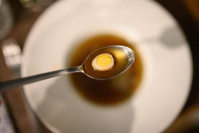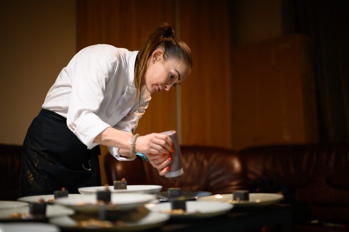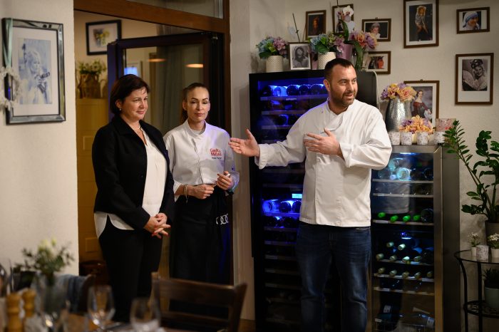 Lelkesedés, precizitás és büszkeség. Egyik pillanatban köszöntötte a vendégeket, aztán már hozta is az asztalokhoz a fogásokat és közben sürgött a konyhában is, pl. sütötte a kacsamájat – melynek a fortélyait is elmesélte közben.