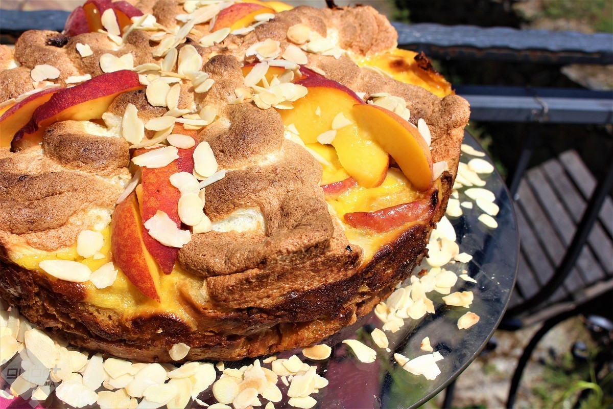Ezalatt az utolsó réteget is elkészítem. A hideg tojások fehérjét mixerrel felverem, amikor kezd kifehéredni, hozzáadom az első kanál cukrot, majd percenként a maradék kettőt is. Ezután spatulára váltok és óvatosan hozzákeverem az aprított, szeletelt mandulát. (Ezt a mandulát általában egy késes aprítógépben vagy egy deszkán készítem el. A szeletelt mandulát összetöröm, hogy a hab is ettől ropogjon.) Habnyomózsákba töltöm vagy sütőpapírból tölcsért hajtogatok. (Egyszerű, YouTube-on megnézhető.) Bármilyen mintában nyomom a tetejére vagy csak kanállal ráhalmozom, de észben tartom, hogy ha kihűlt a torta, akkor ide jönnek még a friss barackok és mandulaszeletek is.