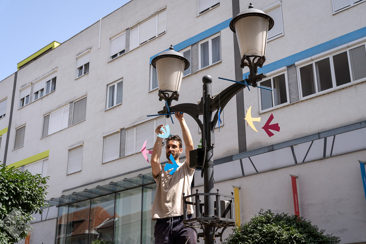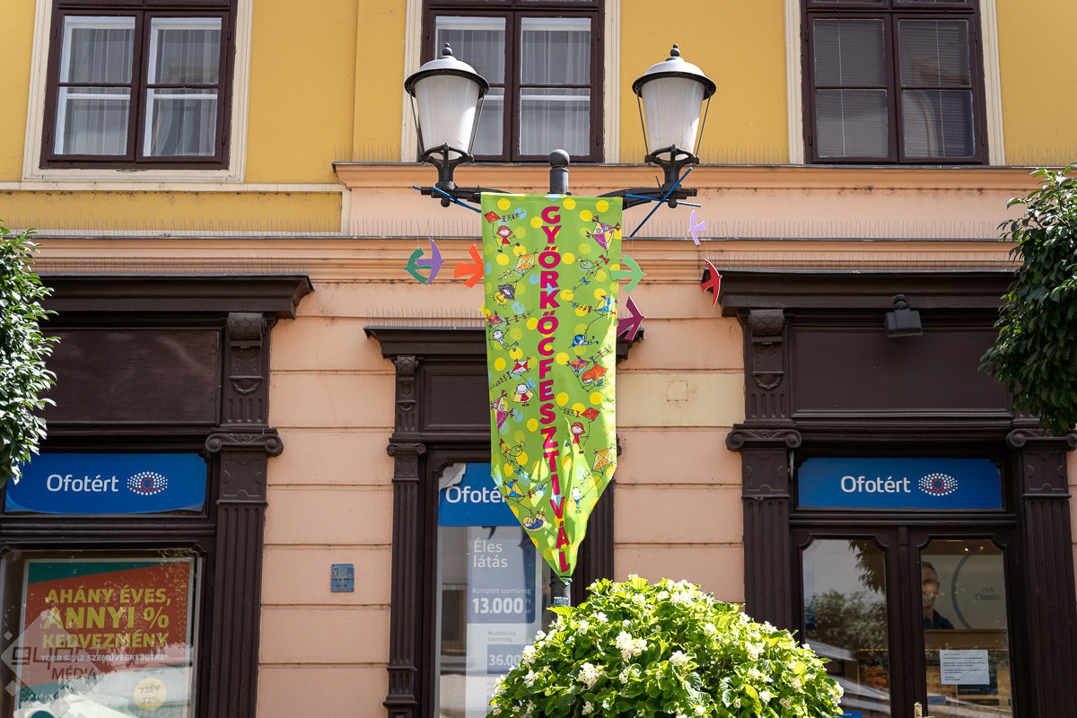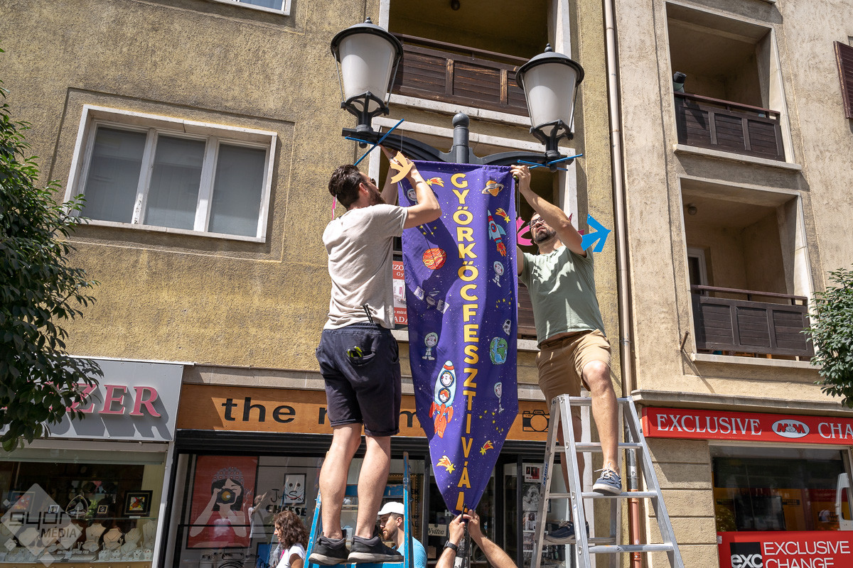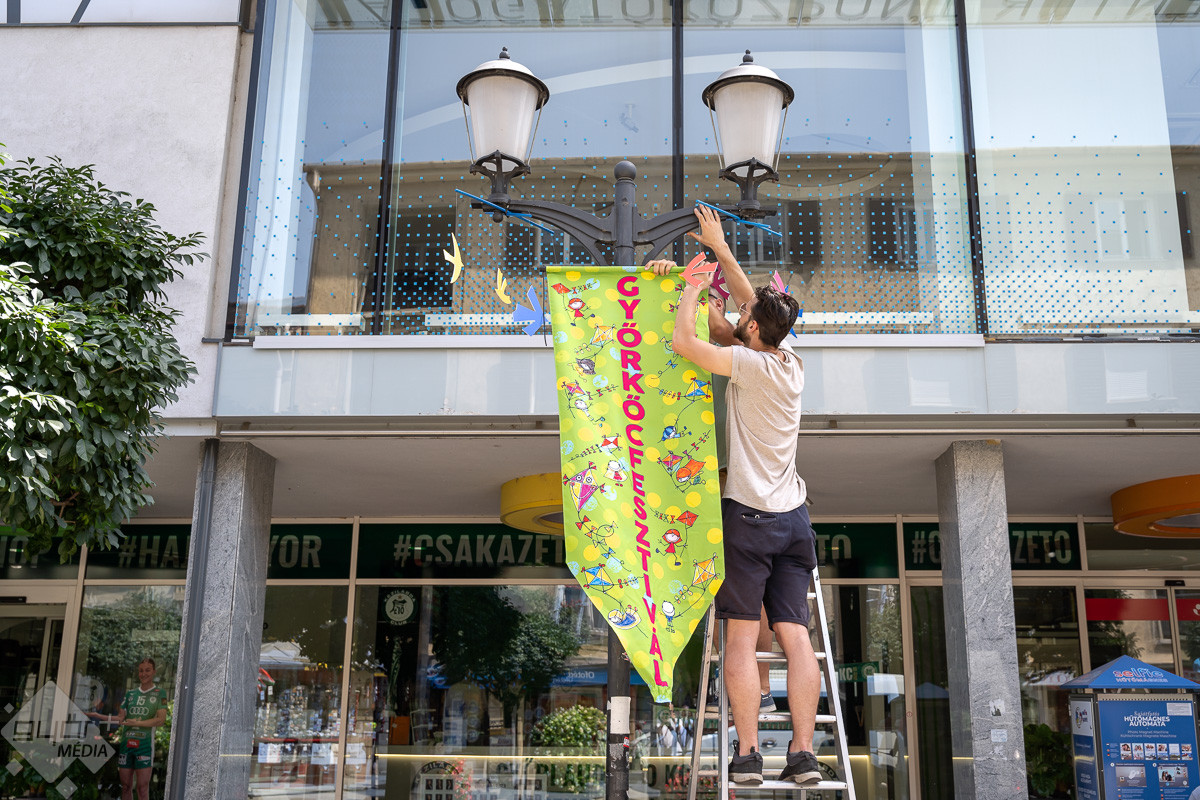 Nagy volt a sürgés forgás pénteken délelőtt a belváros utcáin, hiszen a bábos társulat kreatív és lelkes csapata már most elkezdte ünnepi díszbe öltöztetni Győrt, hogy a jövő pénteken startoló fesztiválra minden időben elkészüljön. Nem kis munkát igényelnek az előkészületek, de örömmel vállalja a fáradtságos munkát a csapat, hogy minél több mosolygós arcot láthassanak. „Már januártól, sőt, kis túlzással az előző fesztivál végétől készülünk az idei rendezvényre úgy, hogy közben előadásokra, bemutatókra is várjuk színházunkba a gyerekeket. Az, hogy megindul a díszítés egyfajta hangolódás, nagyon sokan megszólítottak bennünket. A 16. Győrkőc jelmondata, hogy Szárnyaljunk az égig!, ehhez igazodva alakította ki a dizájnt a világhírű grafikusművész Rófusz Kinga, aki pillangókat, madarakat, szárnyas sárkányokat álmodott a fesztiválra” – árulta el a Győr+ Médiának Kocsis Rozi.