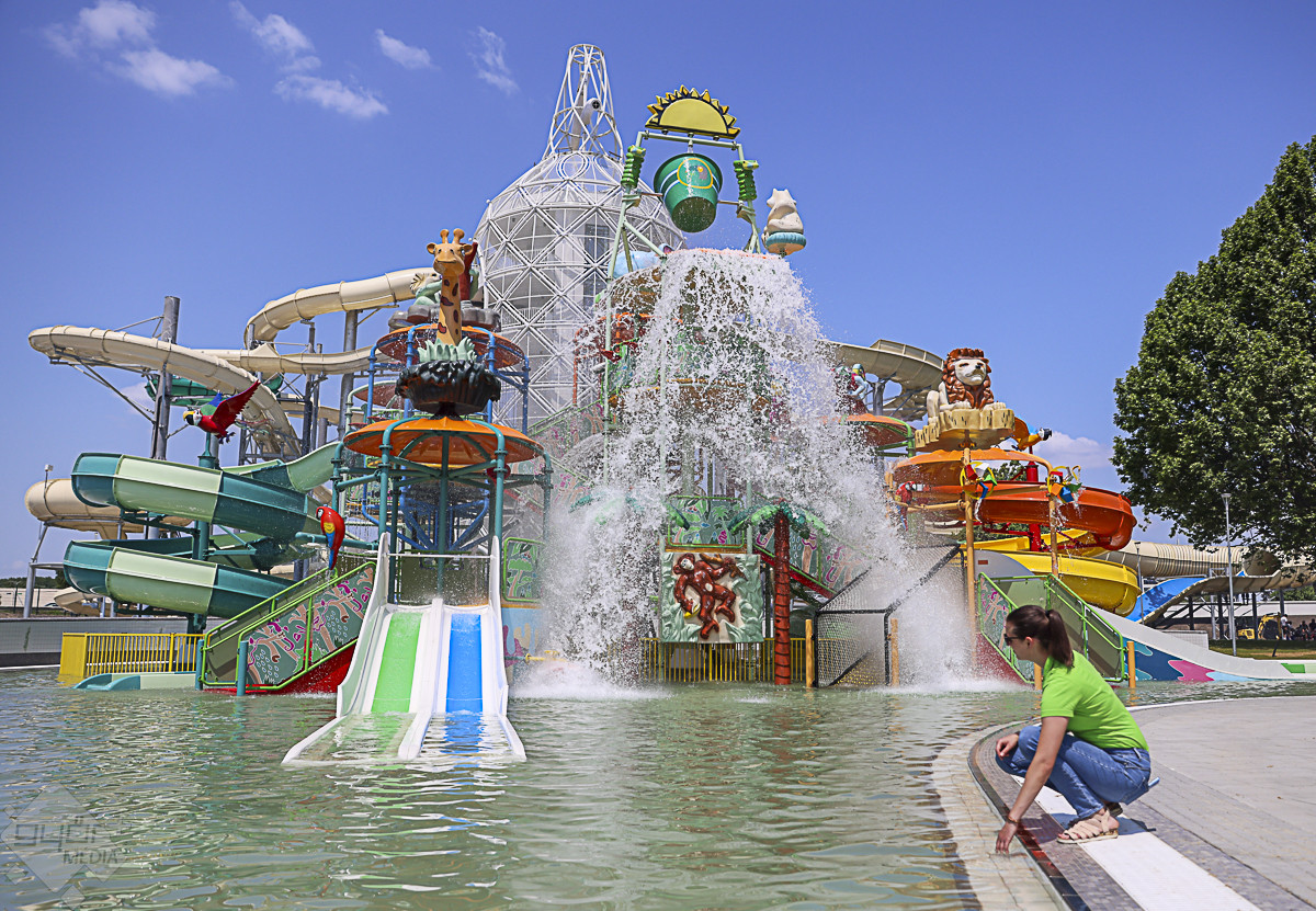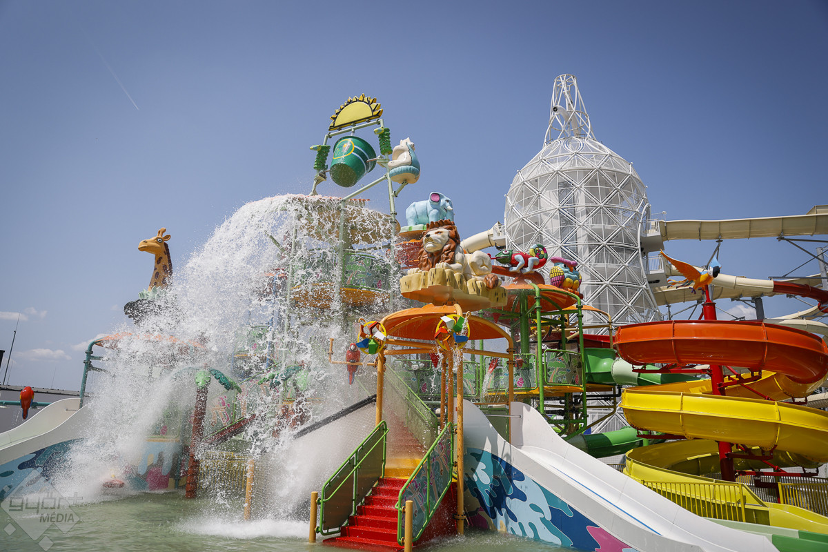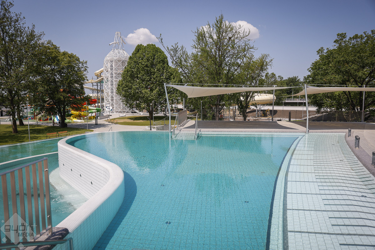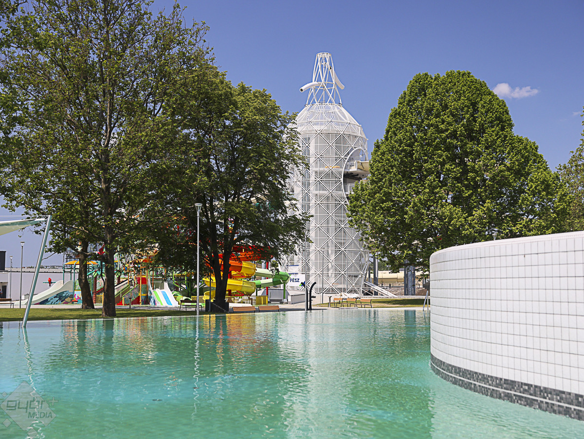 Az árvízvédelmi töltés másik oldalán kialakított három panoráma-medencében egyszerre 500-an fürdőzhetnek. A szódásszifon alakú csúszdatorony üvegfalú panorámaliftje igazi kuriózum, a torony esténként díszkivilágítást kap, leghosszabb csúszdája közel 200 méteres. Az élményparkban összesen 11 vendéglátóhely gondoskodik a látogatók kiszolgálásáról – hangzott el a próbanapon.