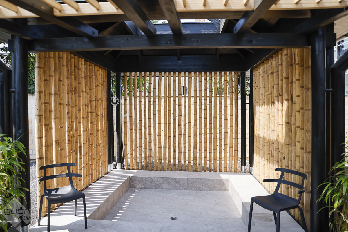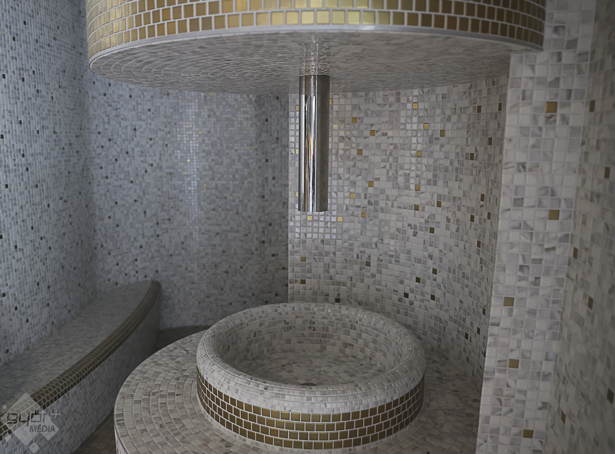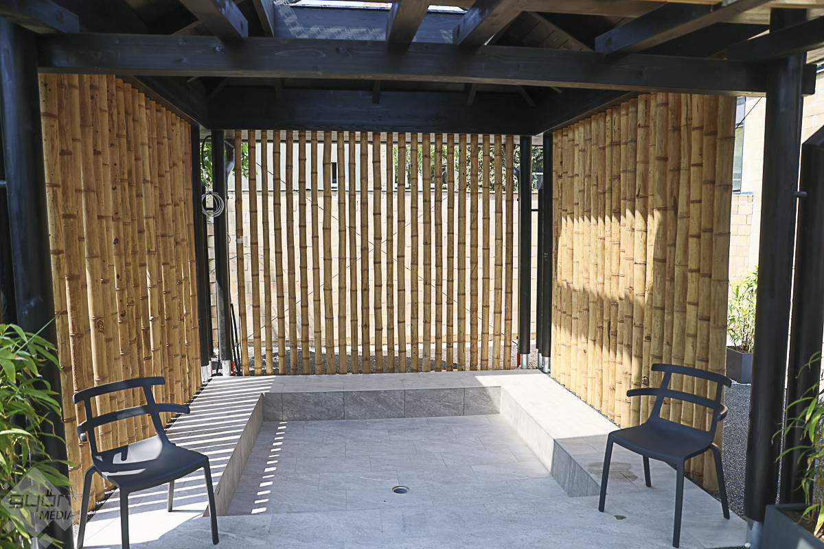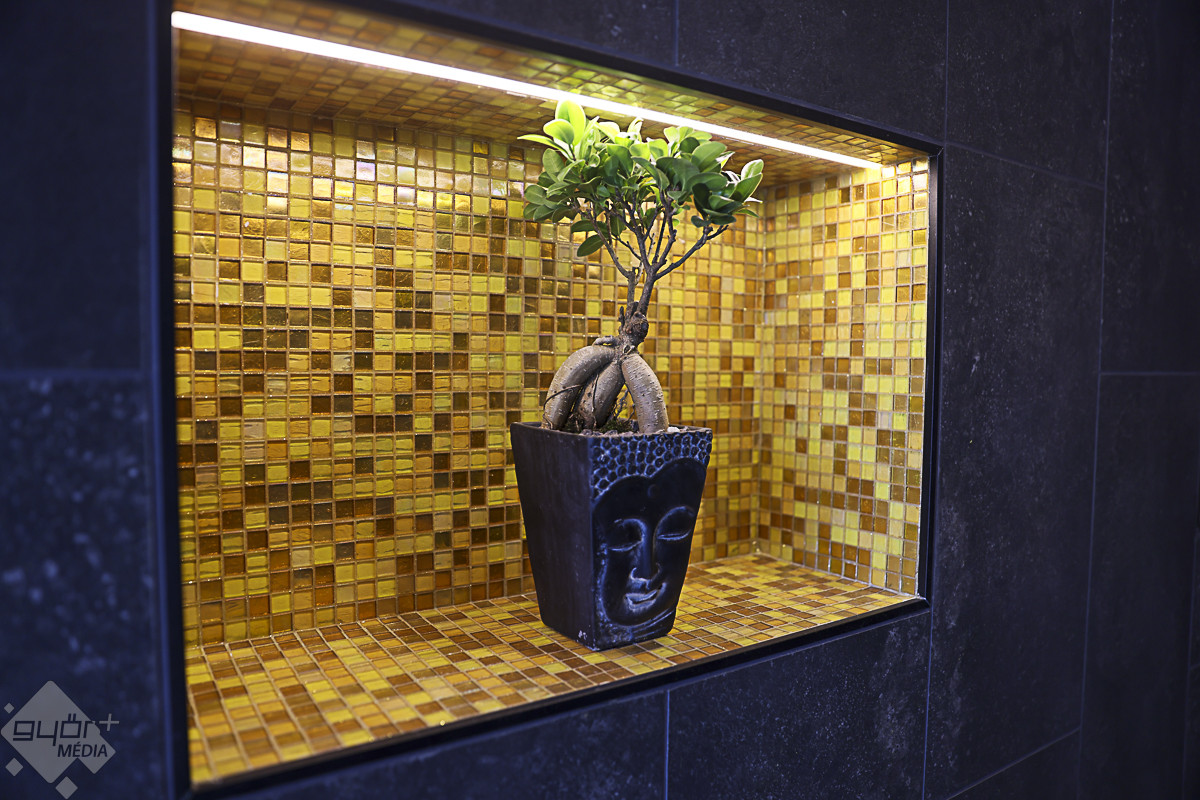 A vezetett séta a 150 fő befogadására alkalmas, egyedi hangulatú japán szaunakertben kezdődött. A pergolákkal és hangulatos, bambusznádas pihenőkkel tarkított szaunakert az ország egyik legnagyobb ilyen részlege, saját pihenőtérrel, gyógyvizes medencével, a hátsó traktusában pedig a Püspökvárra néző üvegfalú panoráma-szaunával.