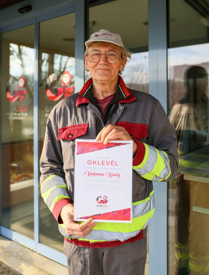 Kaufmann Károly három éve dolgozik a Győr-Szolnál, gépkezelőként. „Traktort kezelek, meg ami jön. A rabkerti munkák, hát, őszintén, kicsit egyedül hagyták őket. Tiszteletem a polgármester úrnak, a mi vezetőségünknek, hogy felkarolták az ottani lakók ügyét” – kezdi Károly, akit A hónap dolgozója címmel ismertek el, ő kapta elsőként a kitüntetést. „Öt centit lenyomtam az ásót, ott volt a talajvíz” – mondja Károly, érzékeltetve a helyzet súlyosságát. Mint elárulta: sokszor volt éjszakai munka is, nagyon sok volt a víz, és nagyon magasan állt. Volt olyan ház, amelynek a beton alapja alól folyt a víz, ott nagyon nehéz dolguk volt, hogy a ház ne süllyedjen meg. A több hetes megfeszített munka eredményét a Győr-Szol egy ajándékcsomaggal jutalmazta, de mint Károly elárulja: soha nem kapott még ilyen kitüntetést, de az ott élők is kedvesek voltak velük, mindig kaptak tőlük forró teát is.