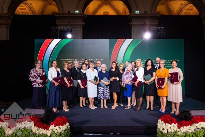 A kitüntetettek Novák Katalin miniszter körében. Jobbról az ötödik Némethné Farkas Kata. (Fotó: CSTNM fotó)