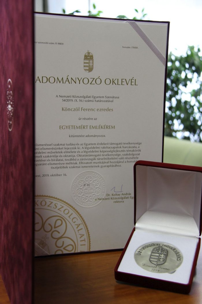 „Az Egyetemért emlékérem” megtisztelő kitüntetést vehette át Könczöl Ferenc ezredes, az MH 12. Arrabona Légvédelmi Rakétaezred parancsnoka november 6-án Budapesten, a Nemzeti Közszolgálati Egyetem Szenátusi ülésén.