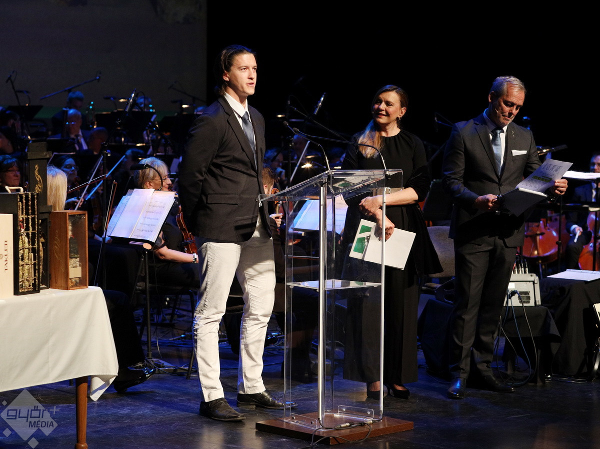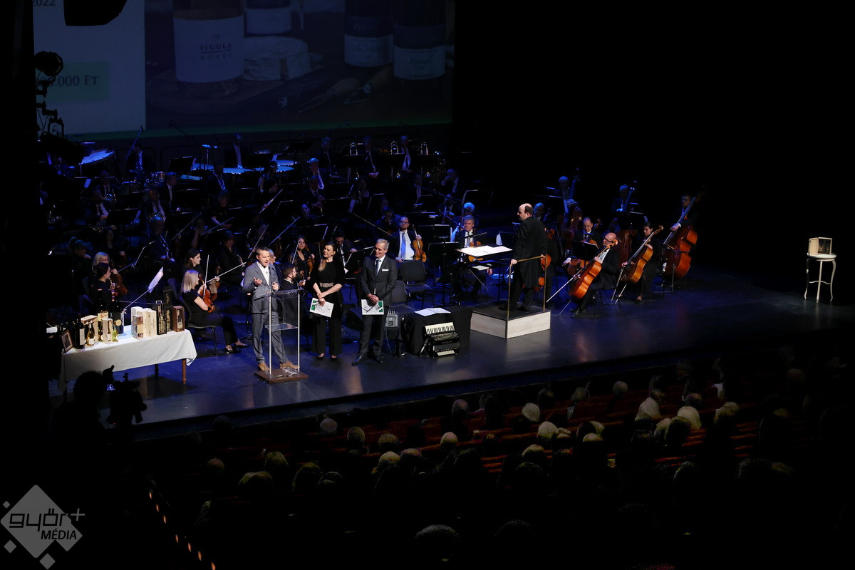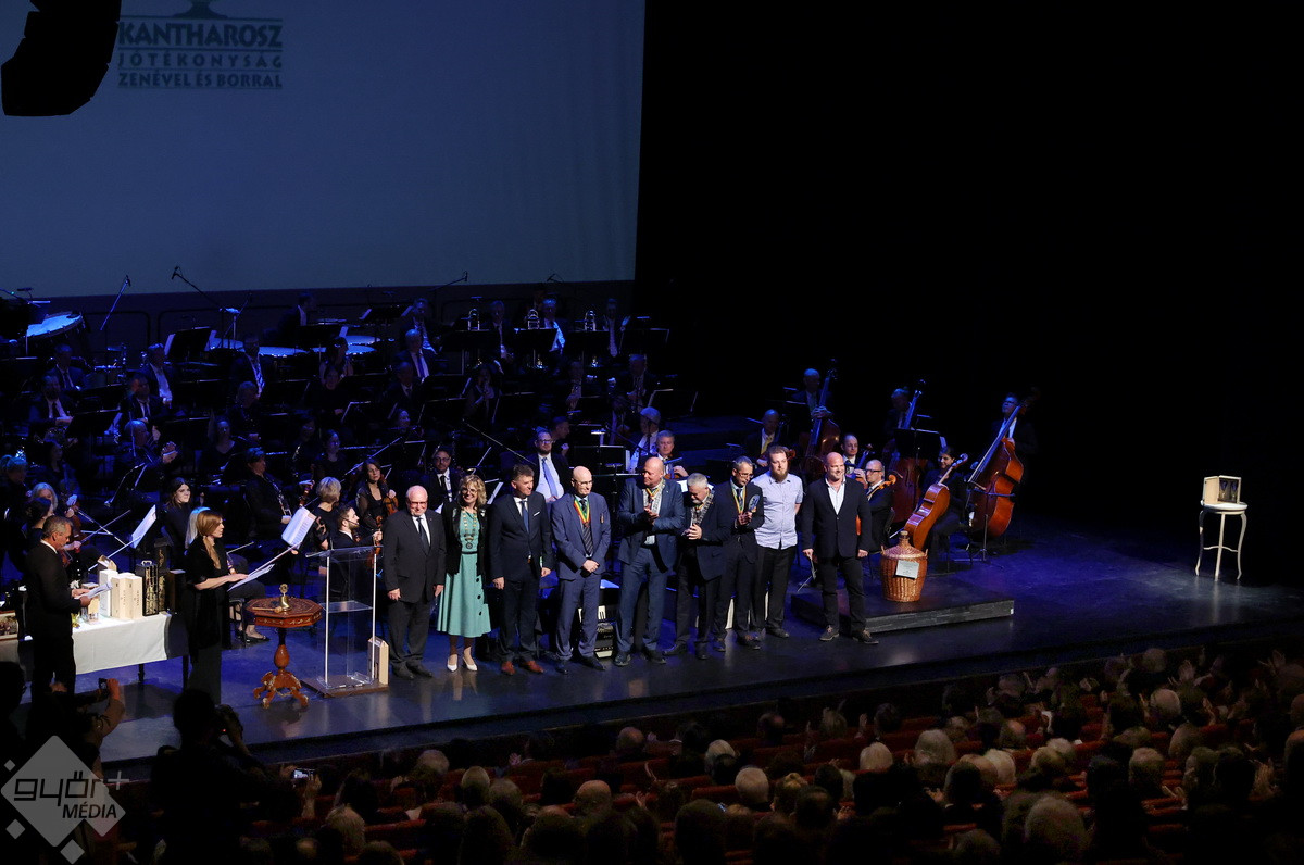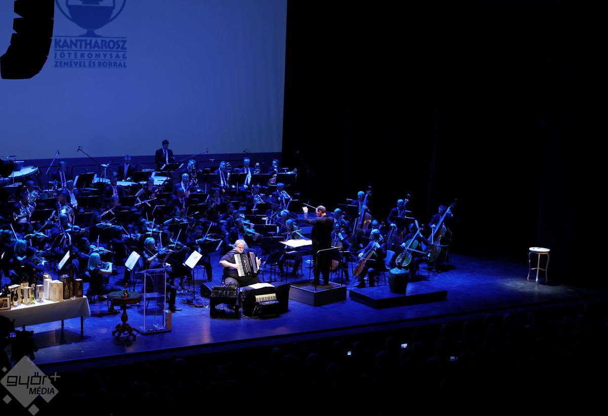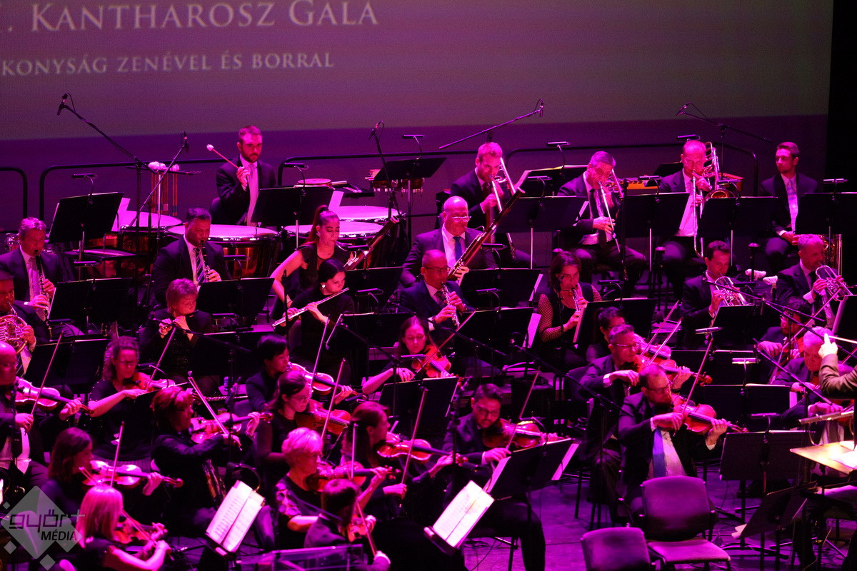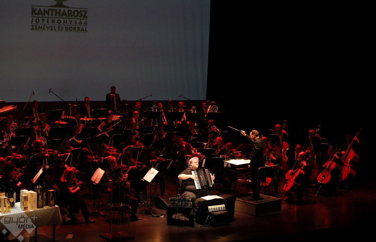 Az est a Győri Filharmonikus Zenekar és Orosz Zoltán játékával indult. A Rácz Márton dirigálta együttes francia sanzonokkal, szláv melódiákkal, Bizet-darabbal repítette a közönséget olyan magaslatokba, ahonnan nagyon nehéz volt visszatérni az eredeti célhoz, a jótékonysági árveréshez. Már az évadtervezéskor tudták, hogy a világhírű harmonikaművésszel, Orosz Zoltánnal fognak a többkoncertes turnén kívül a Kantharoszra is műsort adni – mesélte Fűke Géza, az együttes igazgatója az előzményekről. Erre az alkalomra külön zenei átirattal is készültek, amit a hallgatóság vastapssal hálált meg. A zenekar részéről óriási támogatás, hogy ezen az estén térítésmentesen lépnek fel.