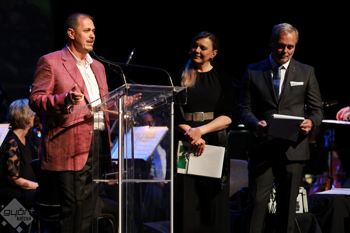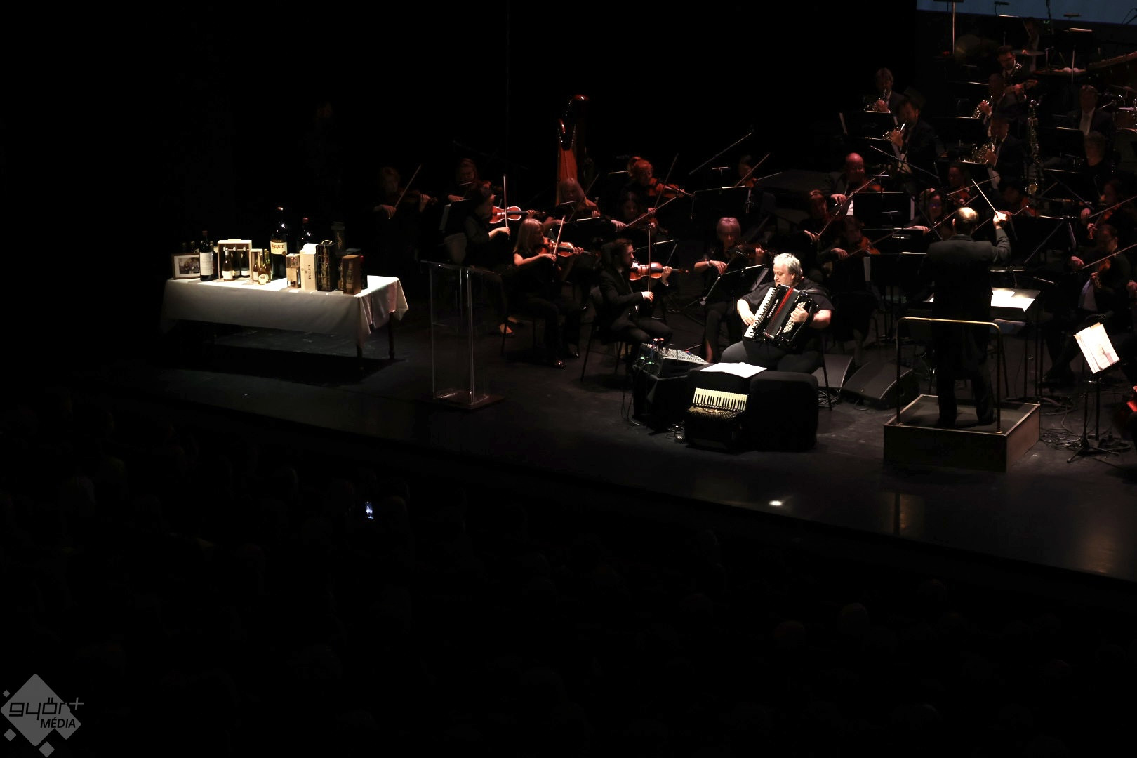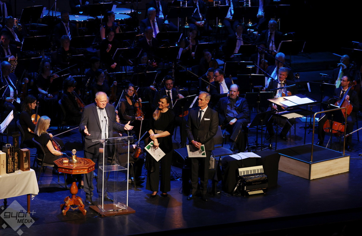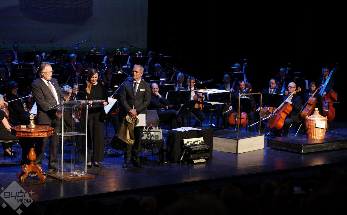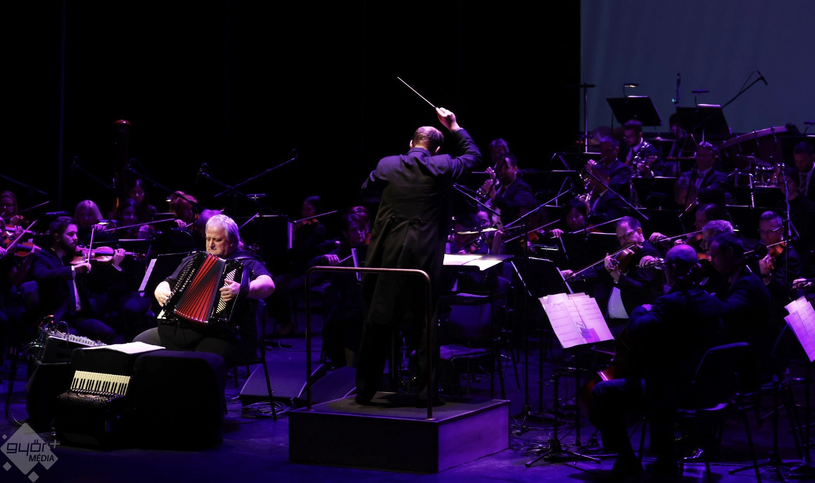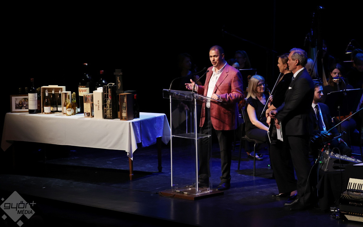 Az est a Győri Filharmonikus Zenekar és Orosz Zoltán játékával indult. A Rácz Márton dirigálta együttes francia sanzonokkal, szláv melódiákkal, Bizet-darabbal repítette a közönséget olyan magaslatokba, ahonnan nagyon nehéz volt visszatérni az eredeti célhoz, a jótékonysági árveréshez. Már az évadtervezéskor tudták, hogy a világhírű harmonikaművésszel, Orosz Zoltánnal fognak a többkoncertes turnén kívül a Kantharoszra is műsort adni – mesélte Fűke Géza, az együttes igazgatója az előzményekről. Erre az alkalomra külön zenei átirattal is készültek, amit a hallgatóság vastapssal hálált meg. A zenekar részéről óriási támogatás, hogy ezen az estén térítésmentesen lépnek fel.