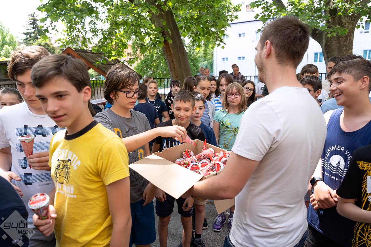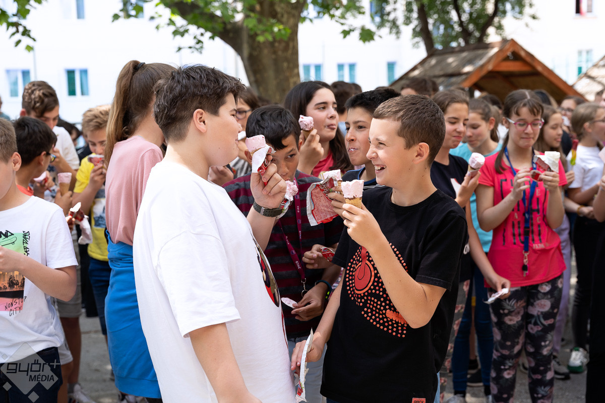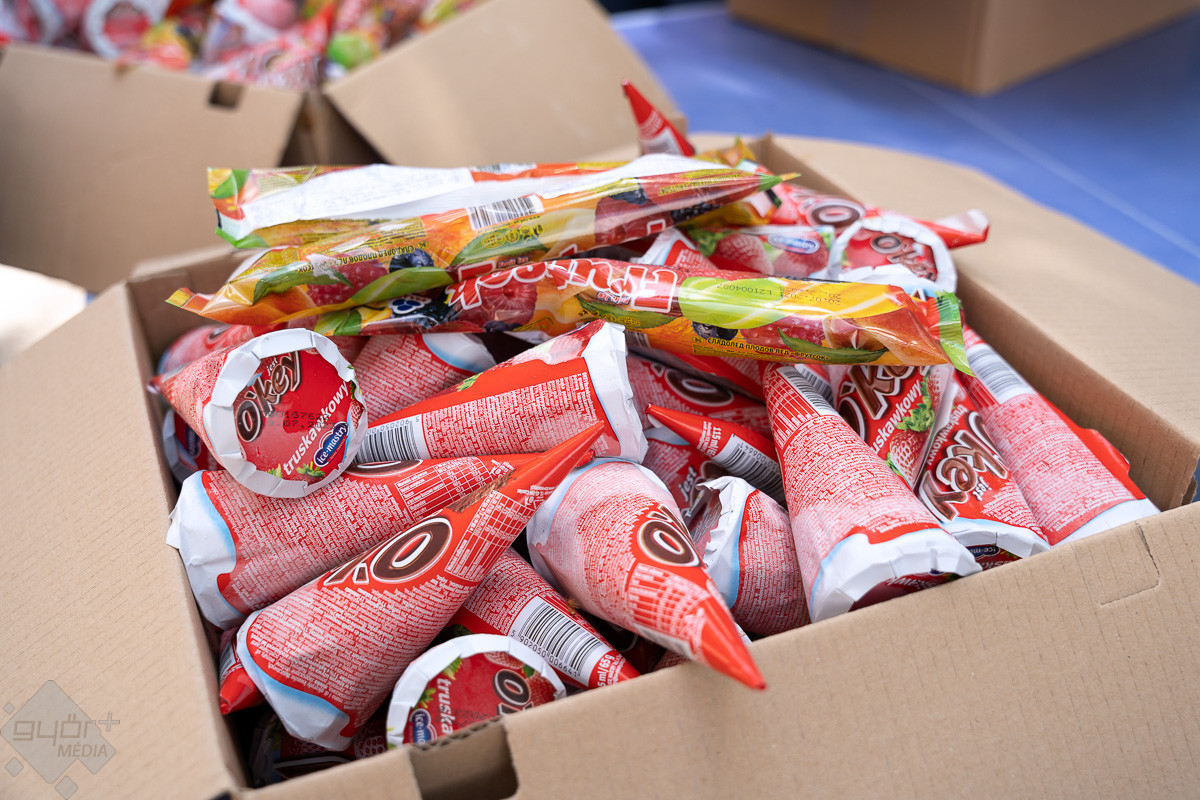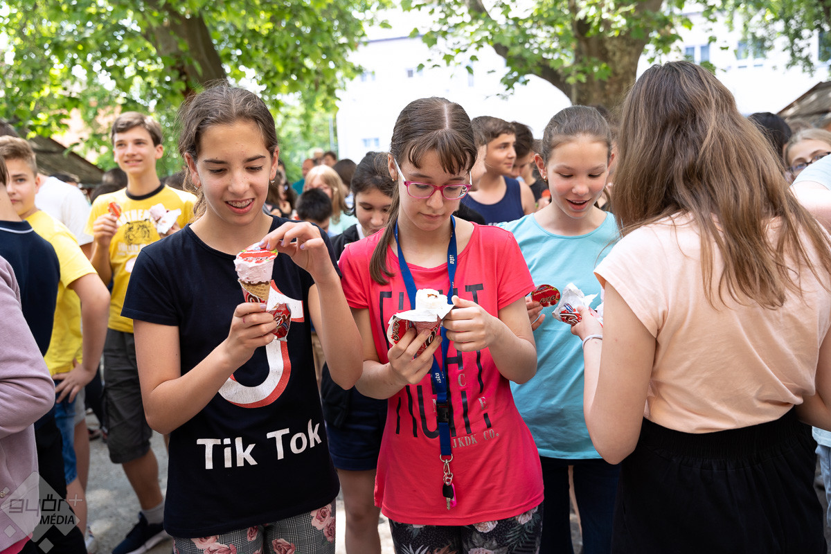 Nagy volt a sürgés-forgás a győri Gárdonyi Géza Általános Iskola udvarán 1 óra előtt néhány perccel, a jégkrémek már az udvaron sorakoztak, majd elkezdődött a gyümölcs, vanília, eper és csokoládé ízű hűsítő finomságok kiosztása.