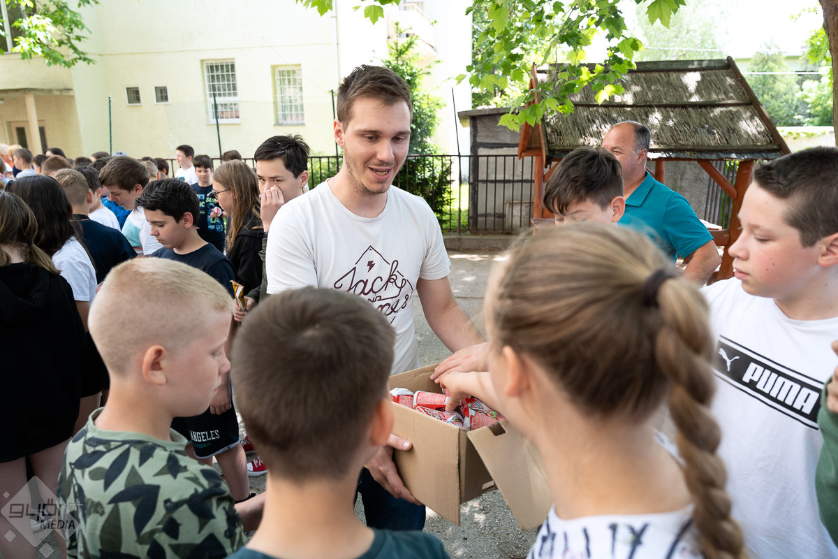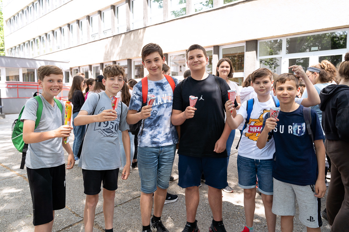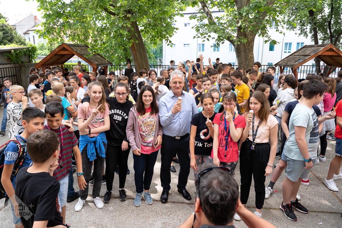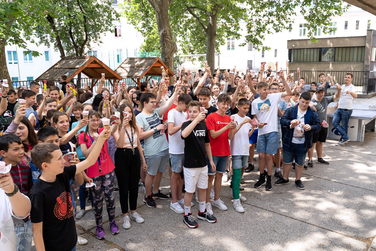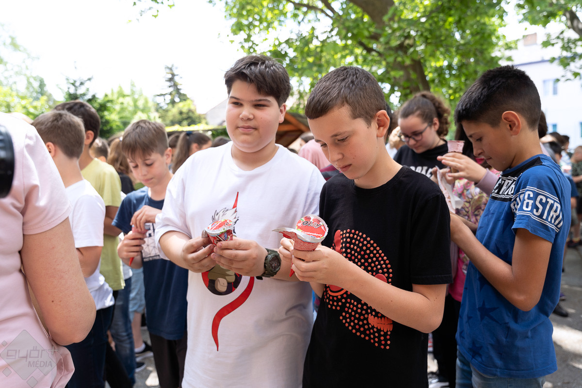 Nagy volt a sürgés-forgás a győri Gárdonyi Géza Általános Iskola udvarán 1 óra előtt néhány perccel, a jégkrémek már az udvaron sorakoztak, majd elkezdődött a gyümölcs, vanília, eper és csokoládé ízű hűsítő finomságok kiosztása.