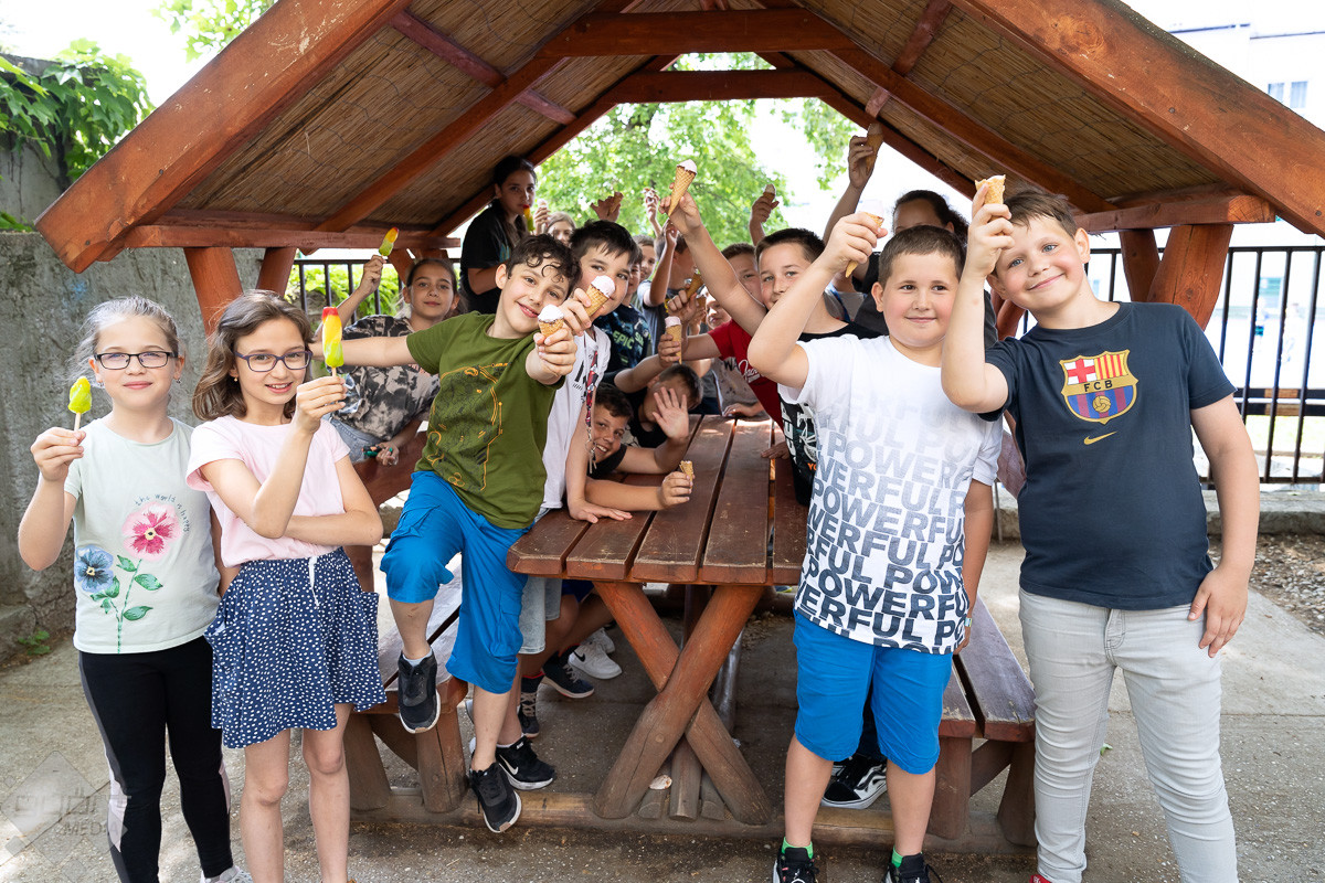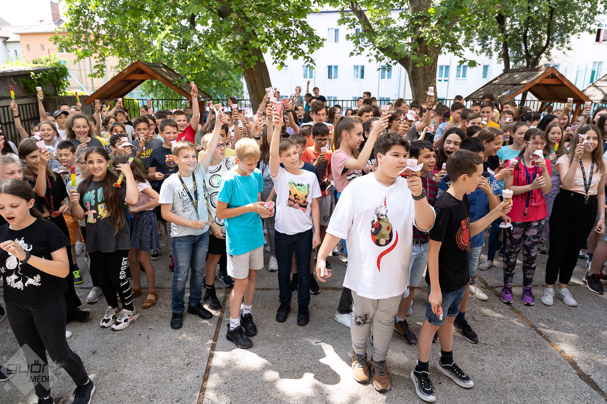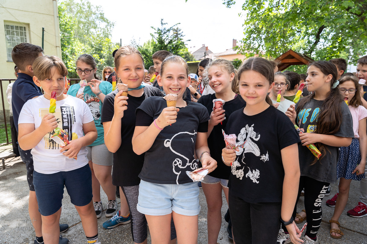 A gyermekek először a magasba emelték a fagyikat, majd megkezdődött a közös jégkrémezés, amelyet nagyon élveztek a diákok.