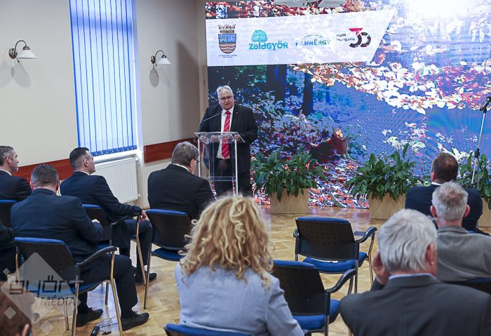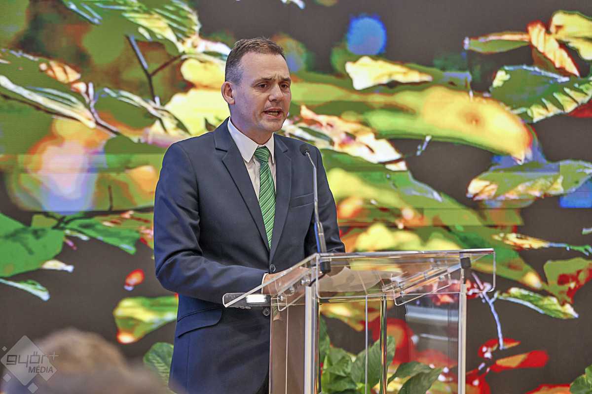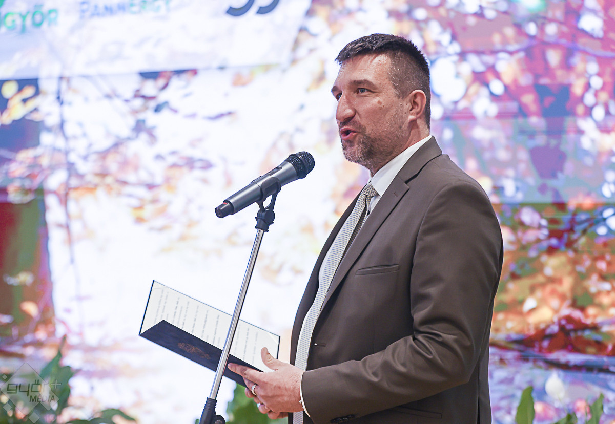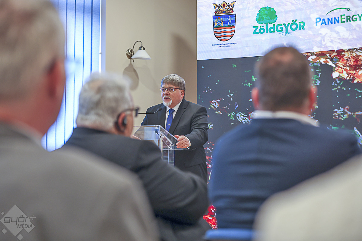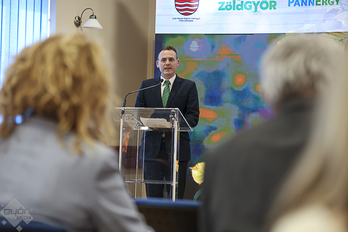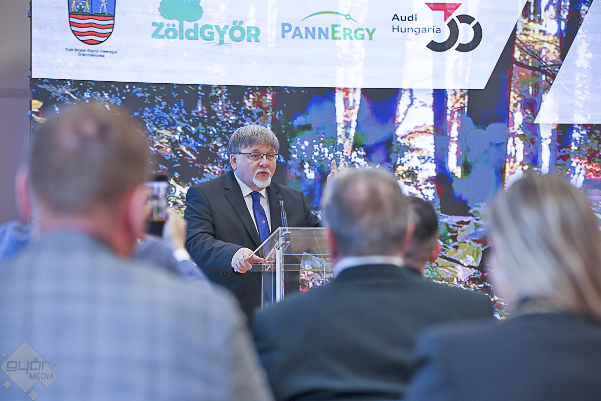 „Amikor polgármester lettem 2020-ban, akkor nem volt Győrben előtérben a környezetvédelem a város tekintetében. Meghirdettük a Zöld Győr programot, létrehoztuk a Környezetvédelmi Bizottságot, dr. Szálasy László elnök vezetésével intenzív környezetvédelmi programot hirdettünk meg” – kezdte dr. Dézsi Csaba András, Győr polgármestere. „Az élet úgy hozta, hogy a Covid-járvány majd az energiaválság miatt az égbe szökött az energiahordozók ára. Ezért is ösztönöztük a távfűtésért is felelős városi cégünket, a Győr-Szolt arra, hogy a lehető legnagyobb arányban használjon fel megújuló energiaforrásokat. Régebben az első helyen a gáz szerepelt a felhasználandó energiahordozók listáján, ezt változtattuk meg, és tettük első helyre a geotermikus energiát” – mutatott rá a polgármester. „Nap mint nap egyre többet teszünk annak érdekében, hogy városunk még élhetőbb legyen. Intenzív fásítási programunk van, védetté tettük a Püspökerdőt, a győrszentiváni tölgyest” – sorolta a polgármester a városi lépéseket a környezetvédelemért.