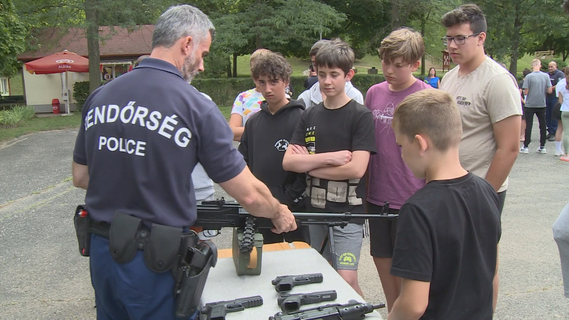 A Győri Gyermektáborba ezúttal rendőrök érkeztek, akik bemutattak egy túszejtést, de még lövések is eldördültek, a fegyvereket pedig egészen közelről is megcsodálhatták a táborozók. Ezt követően kutyás bemutató, majd sportprogramok vártak a gyerekekre. A héten a rendőrségi tábor mellett a Móra iskola diákjai nyaralnak, akiket egy évtizede minden évben igazgatójuk is elkísér.