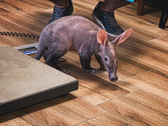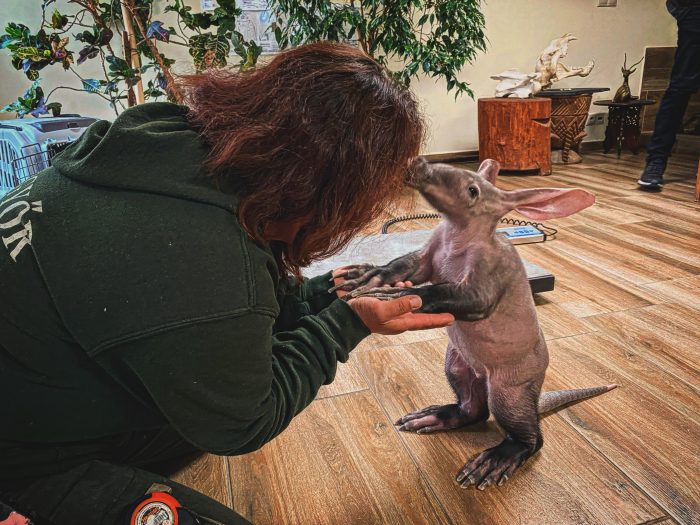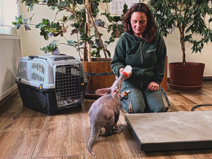 Egy kicsit sem volt félős a különös emlős, mikor a sajtó munkatársai pénteken körülvették az állatkertben. Mitöbb, szívesen szaglászott és barátkozott, nem mellesleg cumizás közben fotózkodott. Sebestyén Esztertől szívesen fogadta a tejpótlót, az állatgondozó volt ugyanis az, aki az utóbbi napokban befogadta otthonába a kis apróságot. „Minden kisbaba nevelése nehézségekkel jár és álmatlan éjszakákkal, de szerencsére nem volt vele semmi probléma. Kicsit félve fogadta a család, de megnyugtattam őket, hogy semmi baj nem lesz, tényleg olyan mint egy csecsemő, csak eszik és alszik. Így is volt az első időkben, aztán ösztönéből adódóan néha elkezdett kaparni, de kellő odafigyeléssel jól megfértünk egymás mellett, az egész lakásunkat használta. Nagyon szerették a gyerekek, barátságos volt, nagyon a szívünkhöz nőtt” – mesélte közös élményeiket az állatgondozó. Eszter elárulta, hogy könnyebb legyen az elválás nem adtak nevet kedvencüknek, de sokféleképpen becézték, így például Nyuszimuszinak vagy Büdinek is.