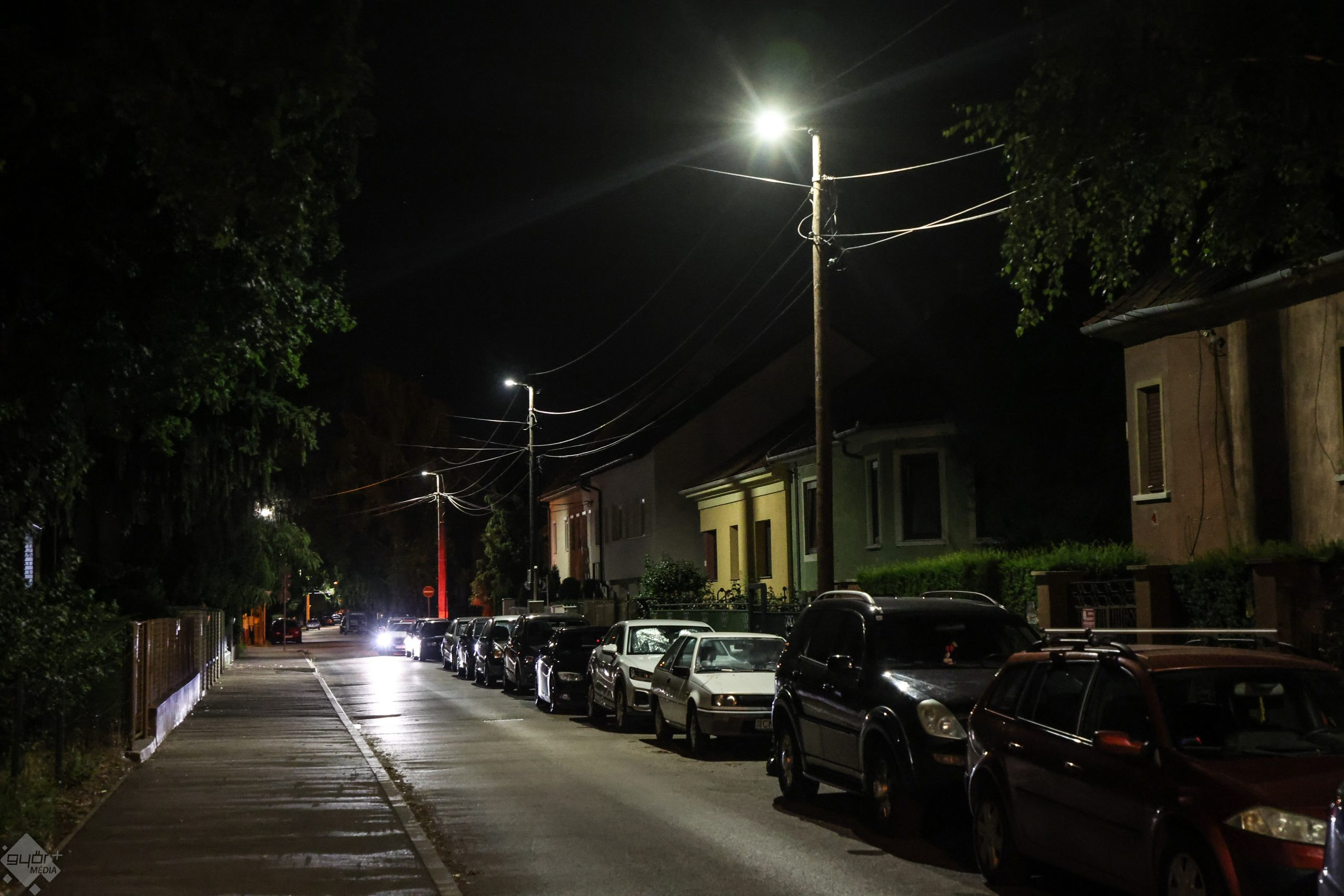 Megnézzük a Liezen-Mayer utca 2–12. előtt tesztelés céljából működtetett lámpák hatásait is. A 70 wattos régi nátriumos lámpákat itt 36 wattos LED-esekre cserélték. Az utca teljesen belátható, a megtakarítás jelentős. Igaz, itt nincs összehasonlítási alapunk, másfajta lámpákat ide nem szereltek fel. A polgármester ezt hiányolja is.