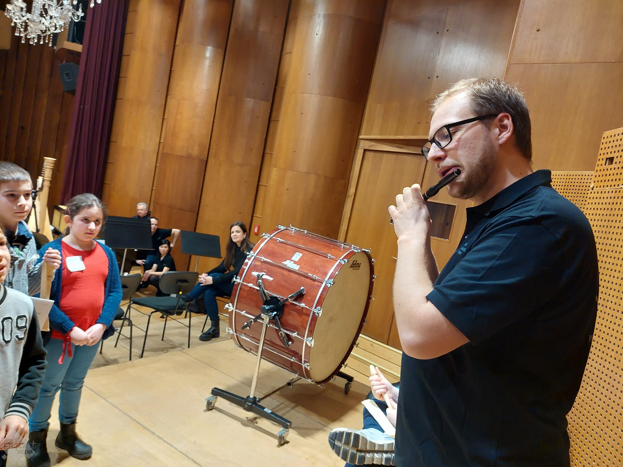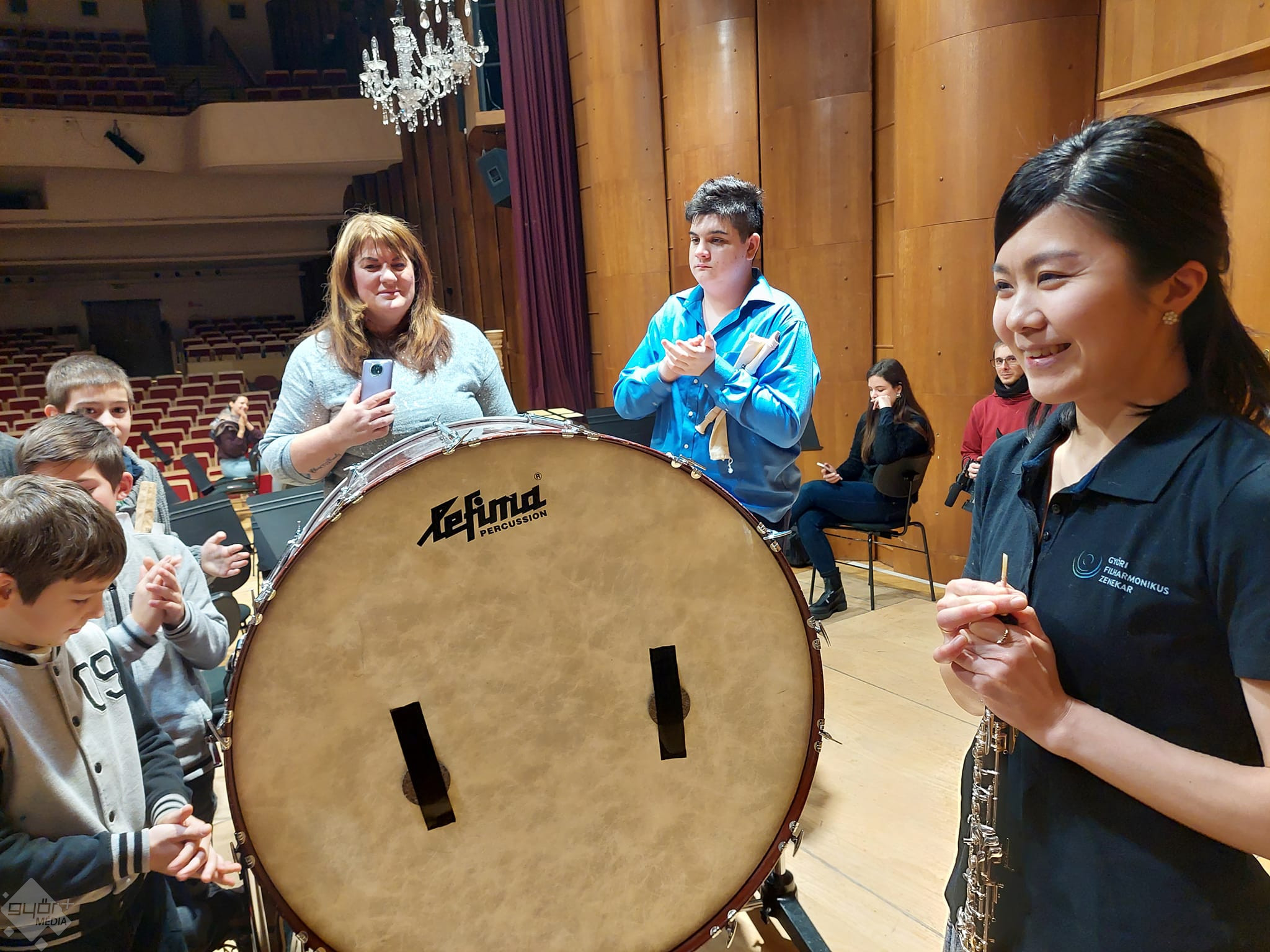 A kicsik “simogathattak” trombitát, oboát, fuvolát és számos ütőhangszert is. Bruno Cascone zenekari művész megmutatta hogy szólnak a kisdob és a harangjáték. A hangszerbemutatót tartó művészek név és hangszer szerint: Vörös Ádám – trombita, Tanisawa Haruka – oboa, Fabian Köhring – fuvola, Bruno Cascone – ütőhangszerek.