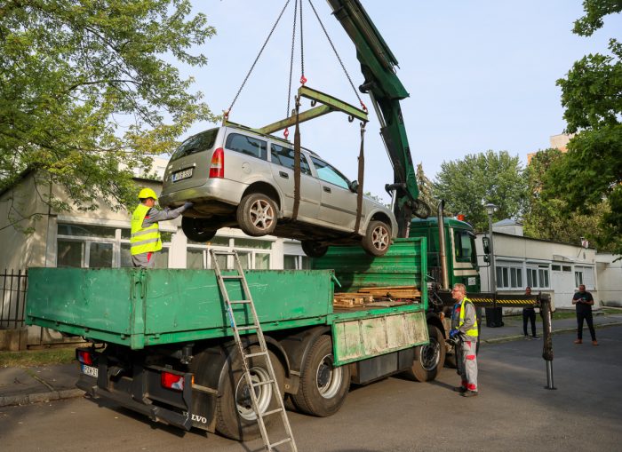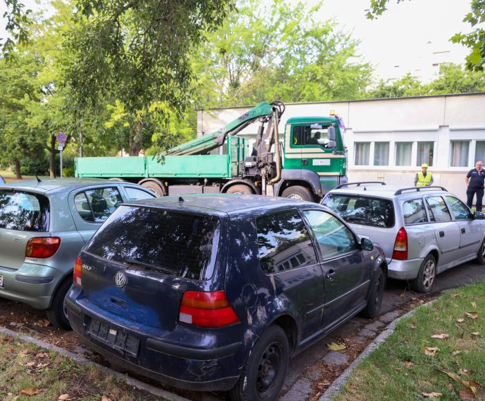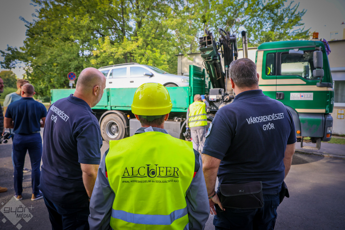 Reggel 8 órakor érkezett meg a speciális darus autó a Répce utca 30-as szám mögötti zsákutcába. Két autó is gazdátlanul állt már itt régóta, a környéken lakók jelentették be a roncsokat.