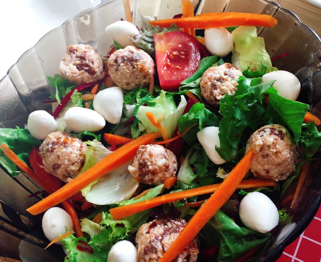 A salátákhoz mindig az öntetet készítjük el először, amit villával alaposan kikeverünk. A megmosott, leszárított, leitatott zöldségeket beleforgatom, hagyom 5 percig állni.