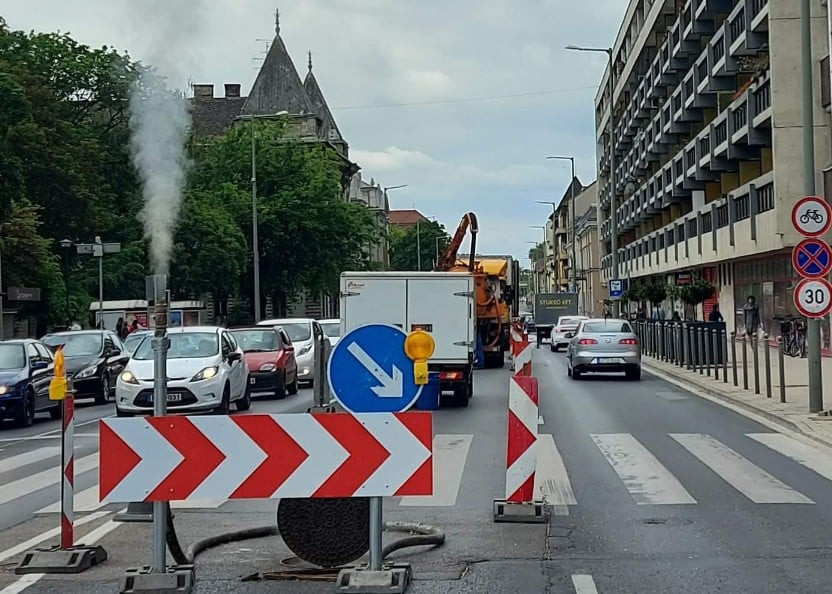 Tavasszal hasonló jelenetnek lehettek szemtanúi a járókelők a Szent István út – Aradi Vértanúk utcai csomópontnál. A sávlezárásra csütörtök délutánig lesz szükség.